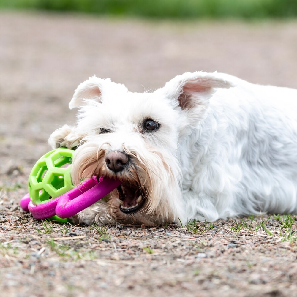 Bal met grote, zeskantige gaten en handvat. Gemengde kleuren. 9 x 19 cm.