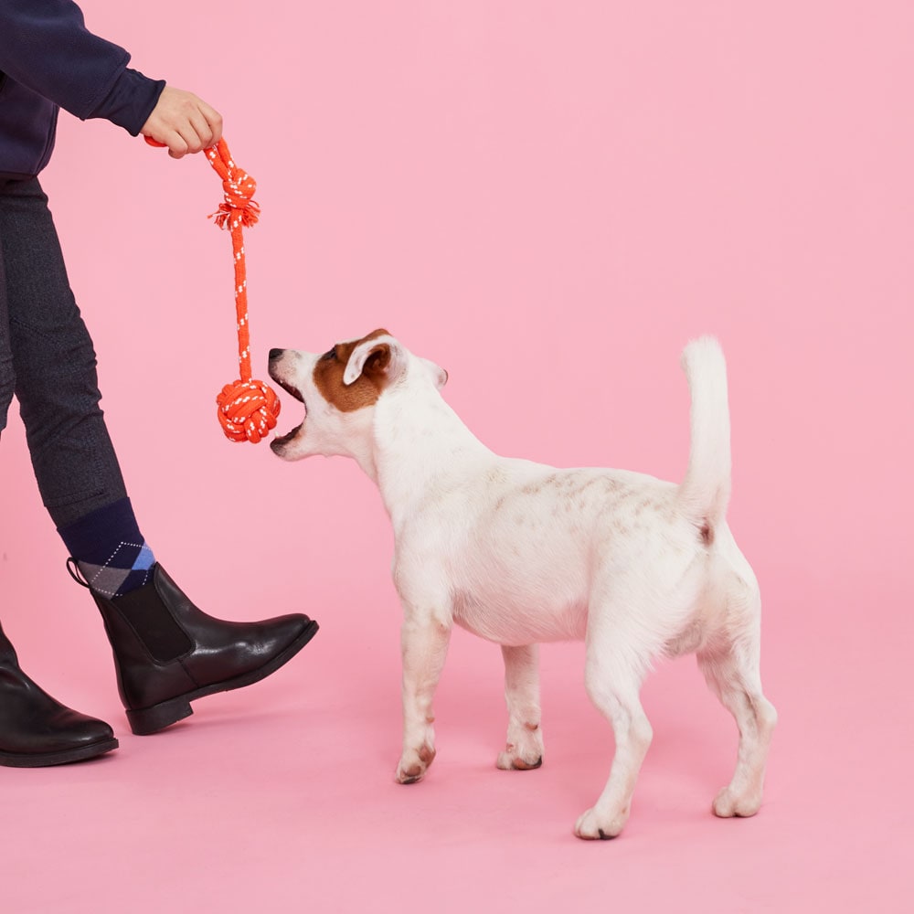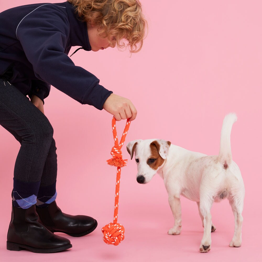 Duurzaam hondenspeeltje van polyester/katoenen touw. Sterke, geknoopte bal met touw en handvat. Leuk om te gooien, te apporteren of om te vechten. Keuze uit vier fraaie kleuren. Totale lengte 40 cm.