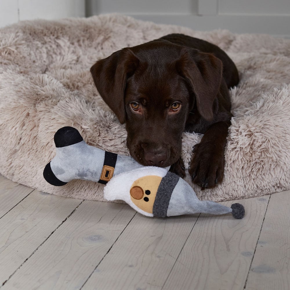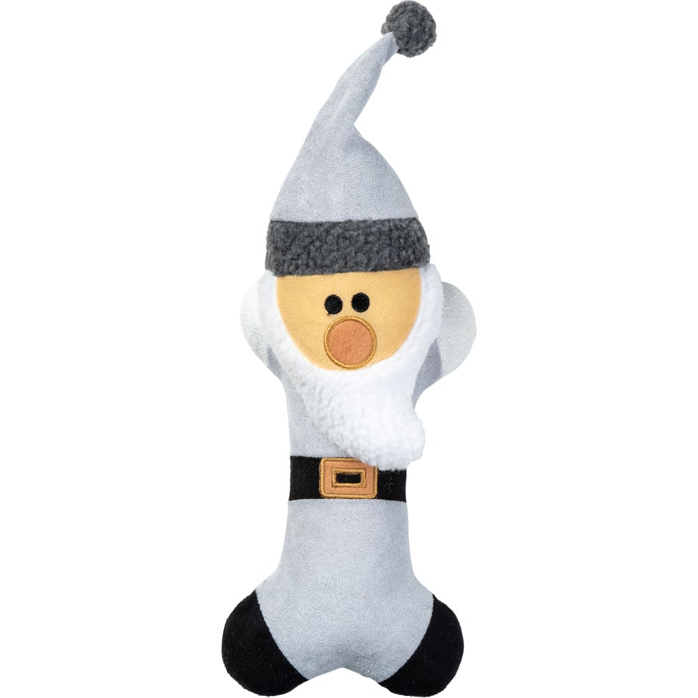 Hondenspeeltje met zachte vulling van namaaksuède. Geïnspireerd op kerstkabouters. Met piepgeluid. Lengte circa 25 cm, van het puntje van de muts tot uiteinde van lichaam.