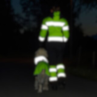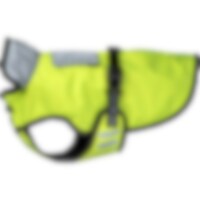 Reflecterende deken van fluorescerend geel 420D polyester met kraag en paspelzakje in reflecterende stof. De gele buitenstof zorgt voor een betere zichtbaarheid in de schemering en de reflecterende randen helpen als het pikdonker is. Waterdicht met 3000 mm waterkolom die de hond droog houdt tijdens de hele wandeling. Gevoerd met dunne microfleece om warmte te bieden met behoud van flexibiliteit. Gat in de kraag voor een halsband en paspelzakjeje op de rug voor het tuig.