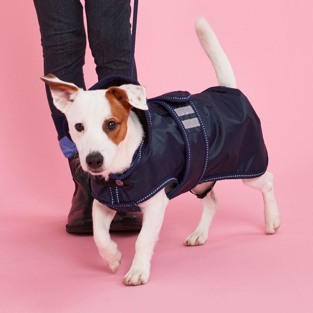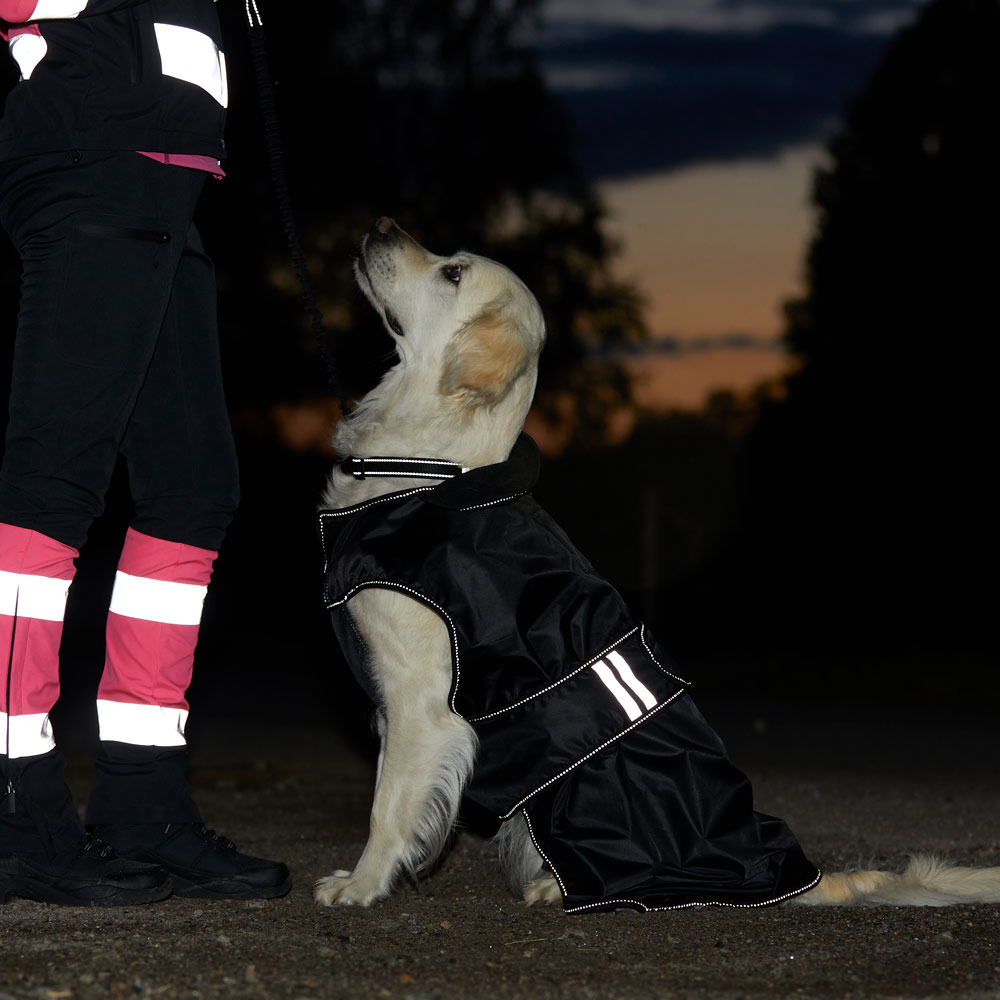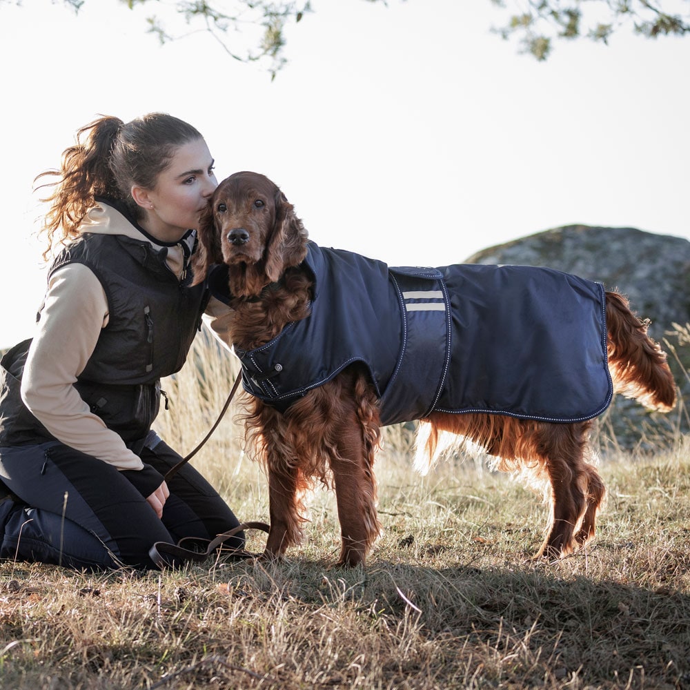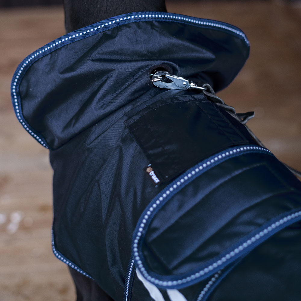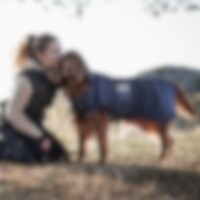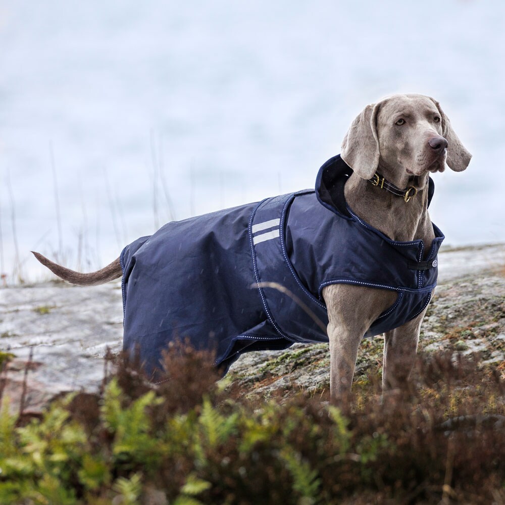 Flexibele regendeken met een lichtgewicht voering van warme fleece. Waterdichte 210D polyester buitenstof met 3000 mm waterkolom om uw hond droog te houden tijdens de hele wandeling en 3000 MVT ademend vermogen om condensvorming onder de deken te voorkome