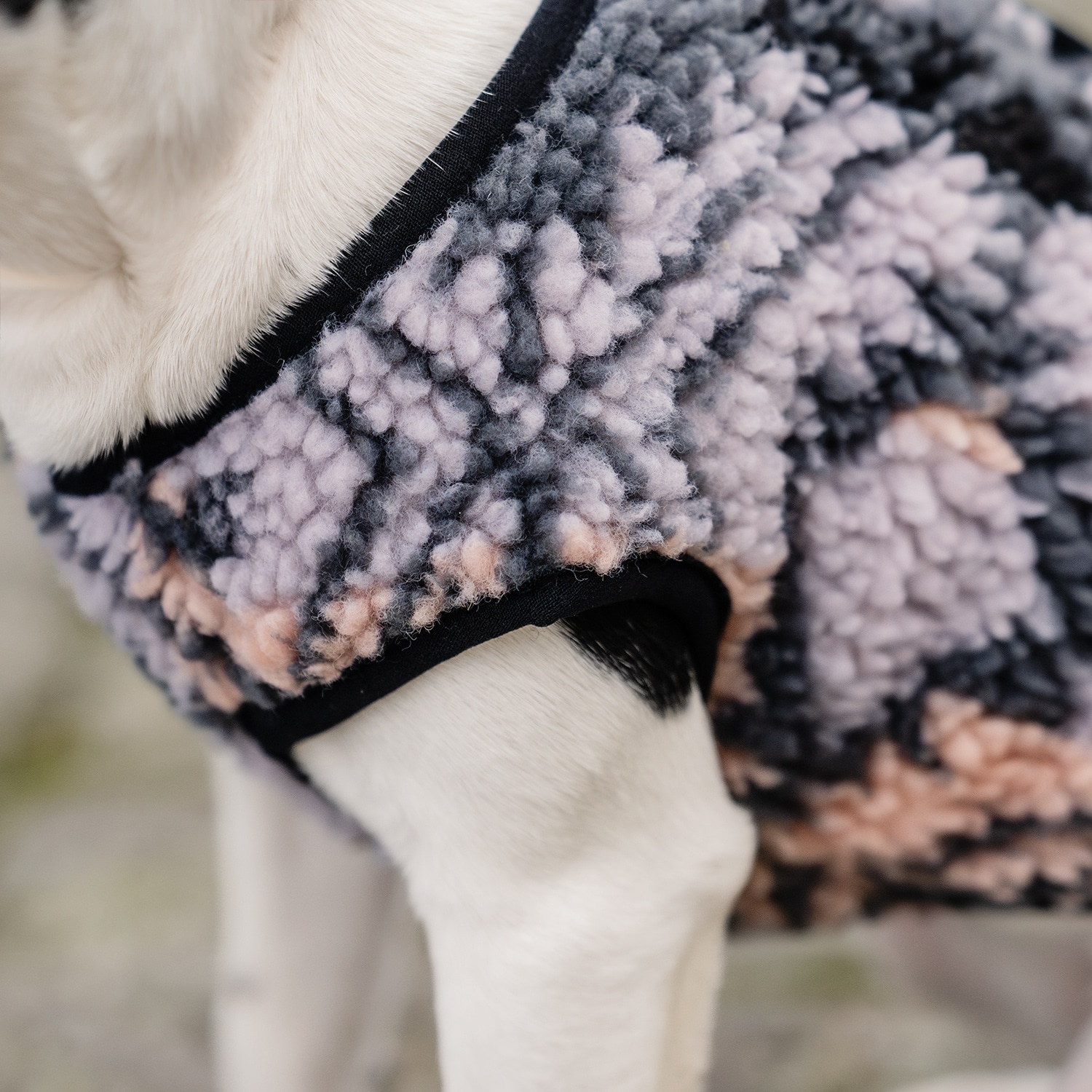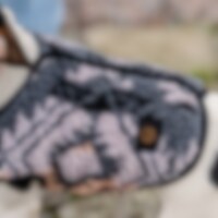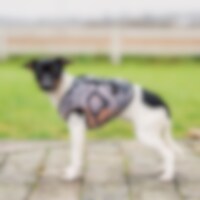 Warme gedessineerde fleece deken met voor een kleine hond. Sluit met drukknopen op de rug. Gedessineerd van 100% polyester.