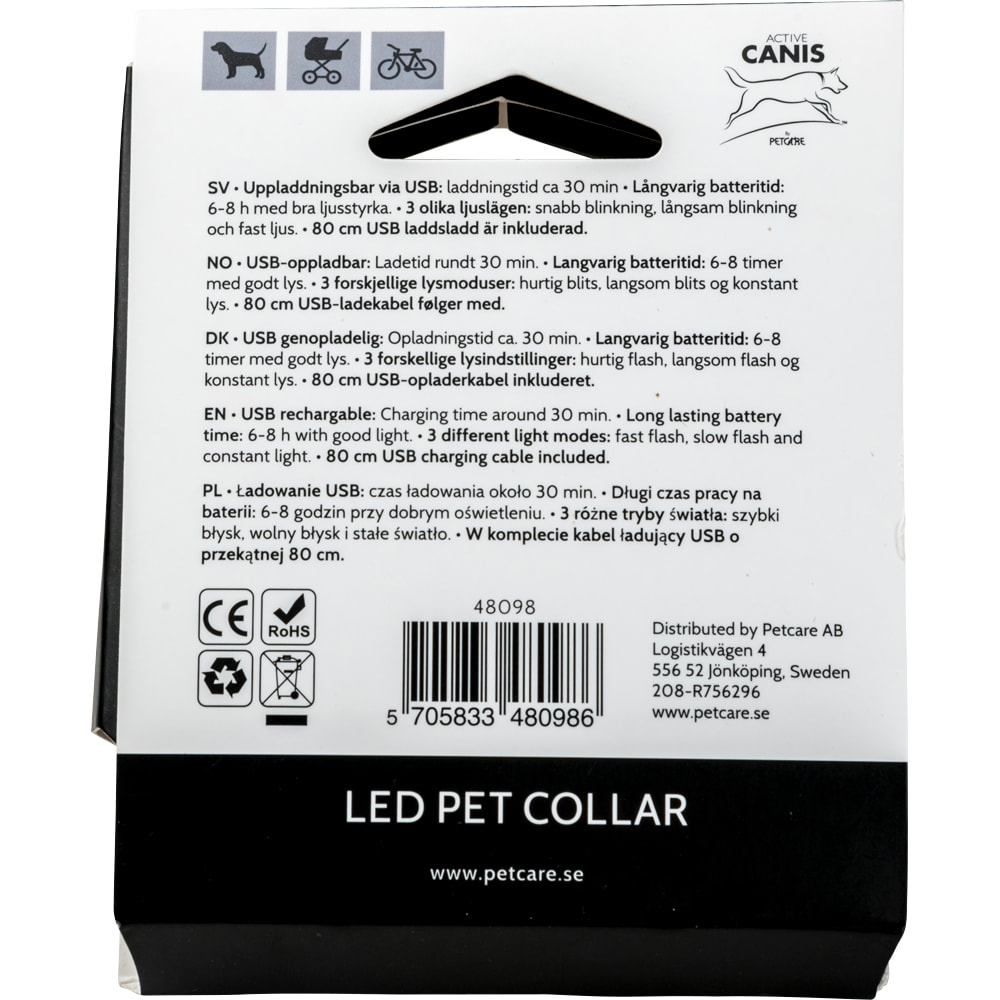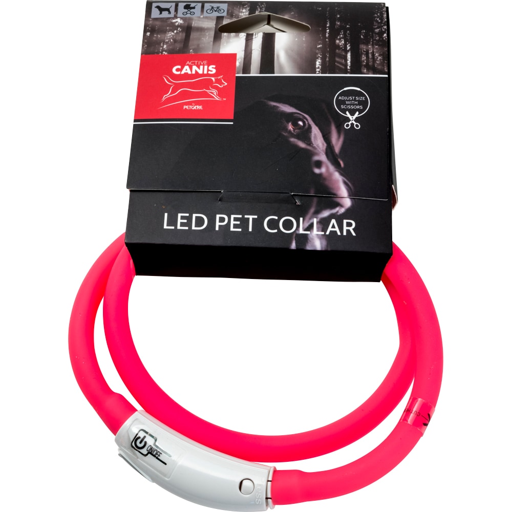 LED-halsband met drie lichtinstellingen: Snel knipperend, langzaam knipperend en constant licht. De halsband wordt opgeladen met een USB-kabel. De halsband is 80 cm lang, maar de maat is eenvoudig aan te passen door op de gewenste lengte te knippen. De batterij laadt op in ongeveer 30 minuten en houdt 6-8 uur sterk licht. Compleet geleverd met een USB-oplaadkabel.