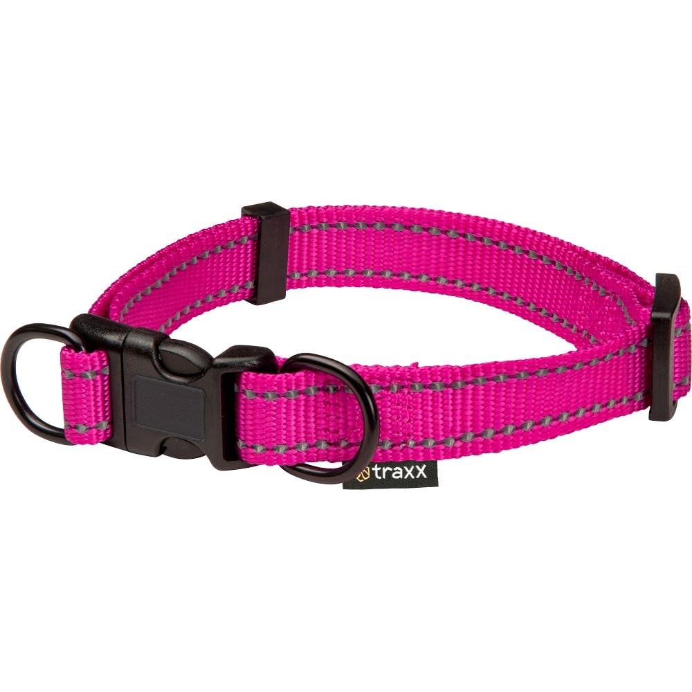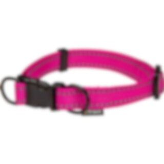 Verstelbare nylon halsband met reflecterende details. Dubbele ringen voor het vastmaken van de lijn. S: 30-40 cm. Breedte: 15 mm. M: 30-50 cm. Breedte: 20mm. L: 45-70 cm. Breedte: 25 mm.