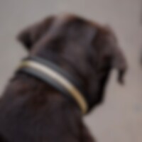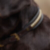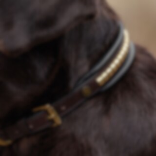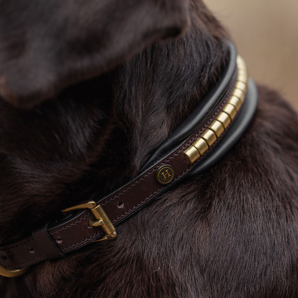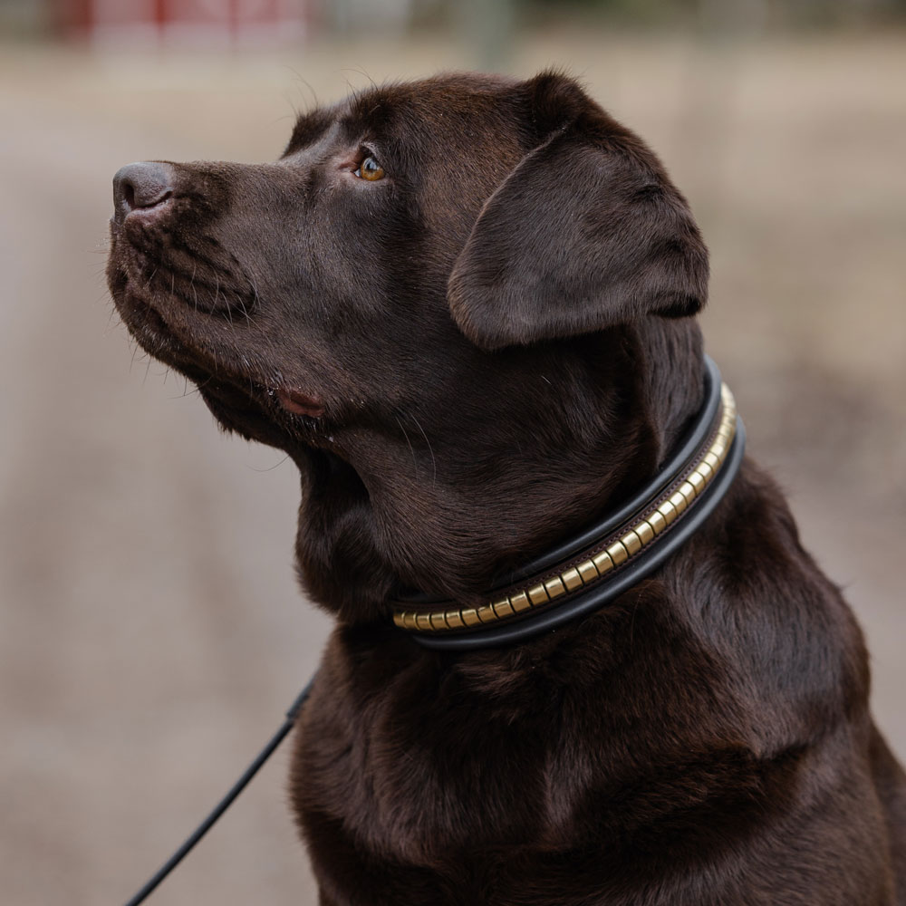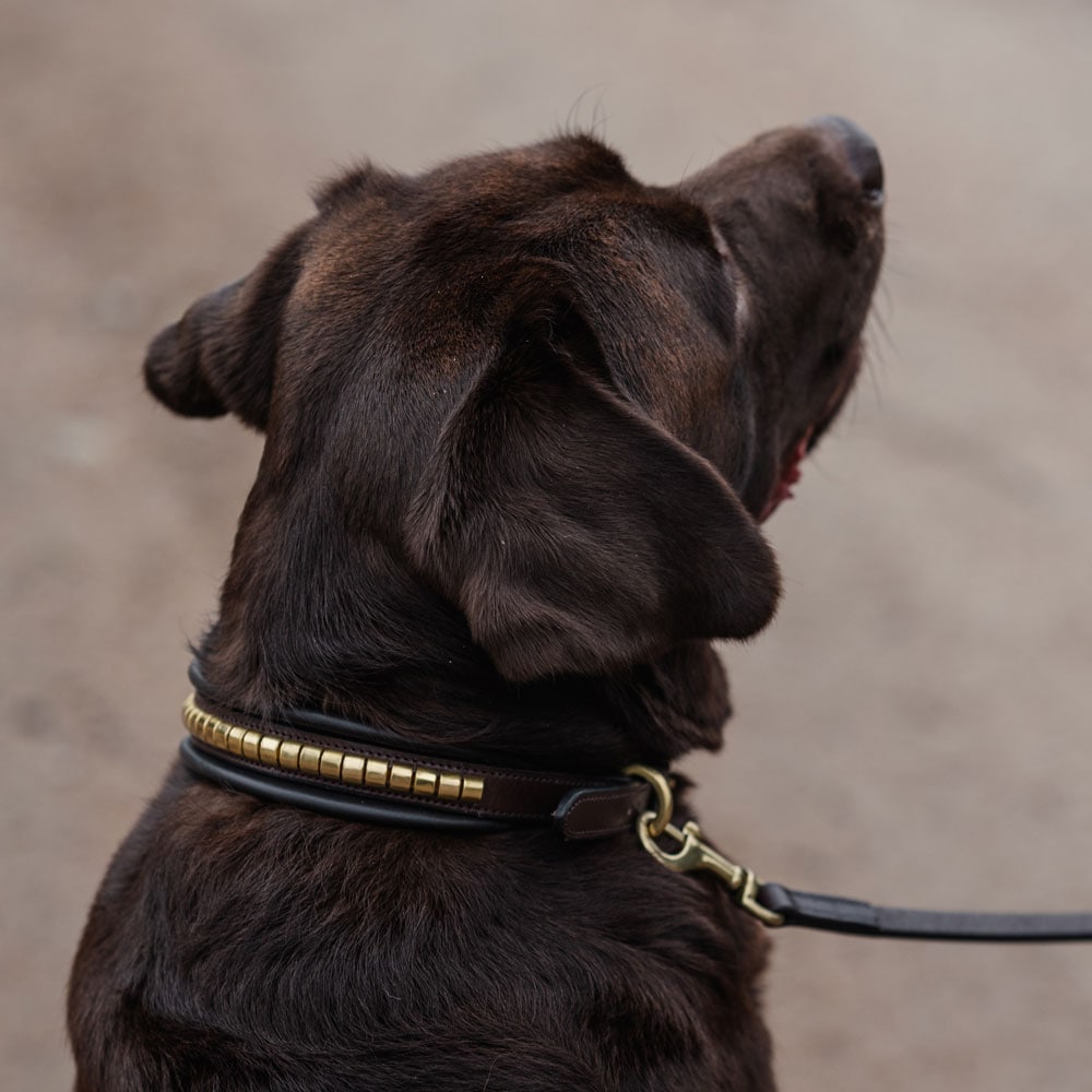 Hondenhalsband ontwikkeld in samenwerking met Carl Hedin en zijn hond Iris. Hondenhalsband van zacht plantaardig gelooid leer, versierd met klinknagels. Gevoerd met opgehoogde vulling. Messingkleurige gesp.