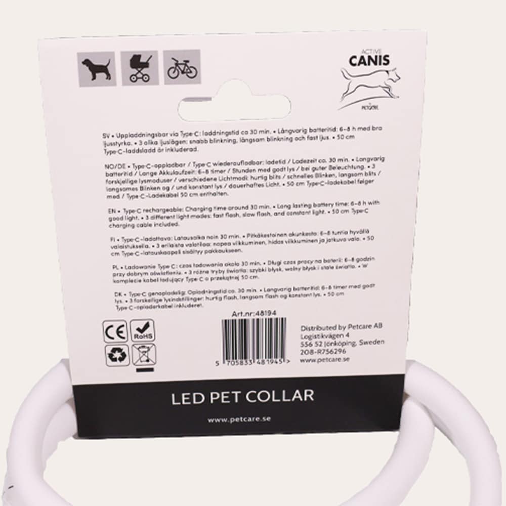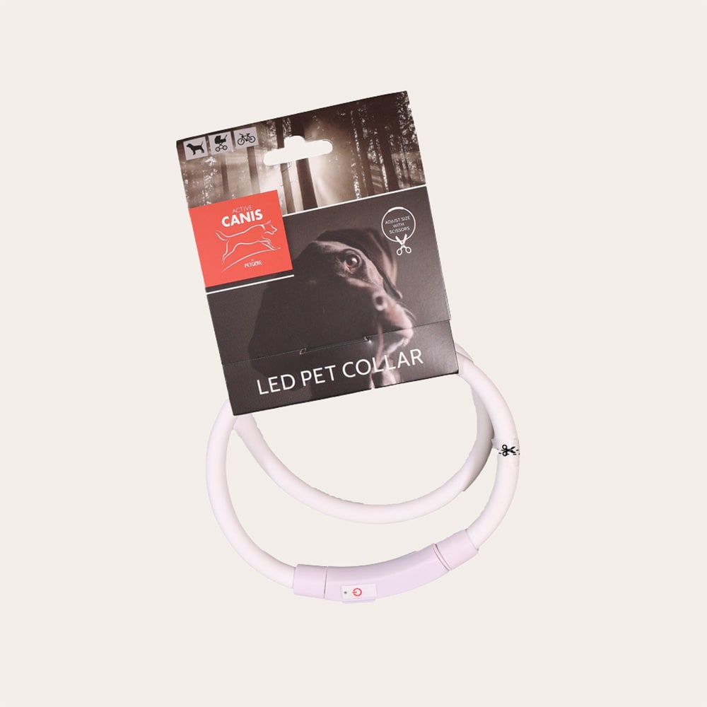 LED-halsband met drie lichtinstellingen: Snel knipperend, langzaam knipperend en constant licht. De halsband wordt opgeladen met een USB-kabel. De halsband is 80 cm lang, maar de maat is eenvoudig aan te passen door op de gewenste lengte te knippen. De batterij laadt op in ongeveer 30 minuten en houdt 6-8 uur sterk licht. Compleet geleverd met een USB-oplaadkabel.