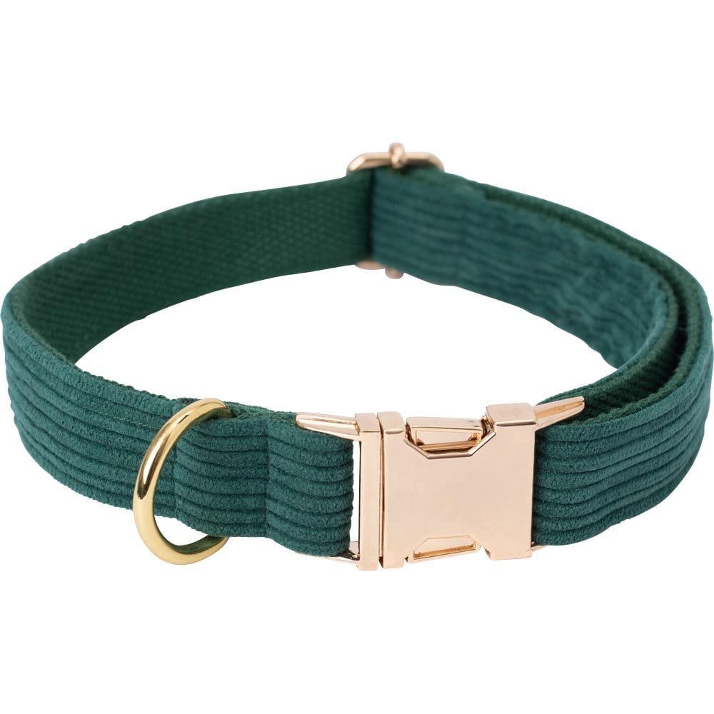 Verstelbare halsband van ribfluweel met polyesterversterking aan de binnenzijde. Maat S: 30-42 cm, breedte 2 cm, M: 40-55 cm, breedte 2,5 cm, L: 53-65 cm, breedte 2,5 cm.