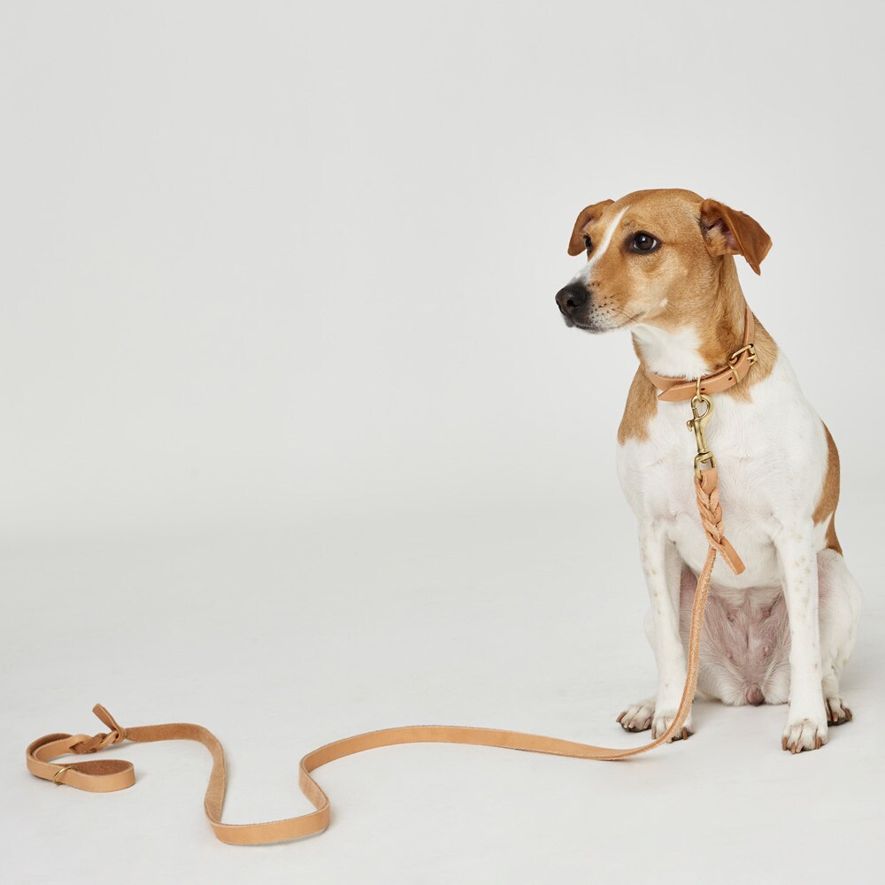 Hondenriem van licht, naturelkleurig leer met klassieke gevlochten sluitingen voor handvat en aan trekkerclip. Breedte 15 mm. Lengte 180 cm. Komt overeen met hondenhalsband 043152.