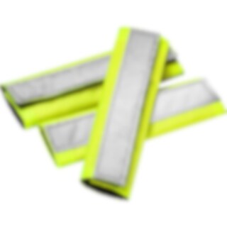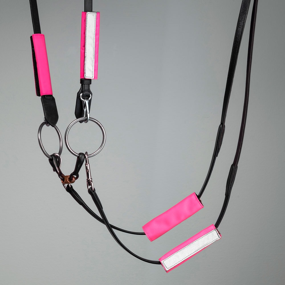 Set met 3 reflecterende prints om op teugels en neusband te bevestigen. Kan natuurlijk ook op andere plaatsen worden gebruikt, zoals borst, stijgbeugels en hondenriem. Fluorescerend polyester met reflecterende details van 3M. Bevestiging met klittenband.