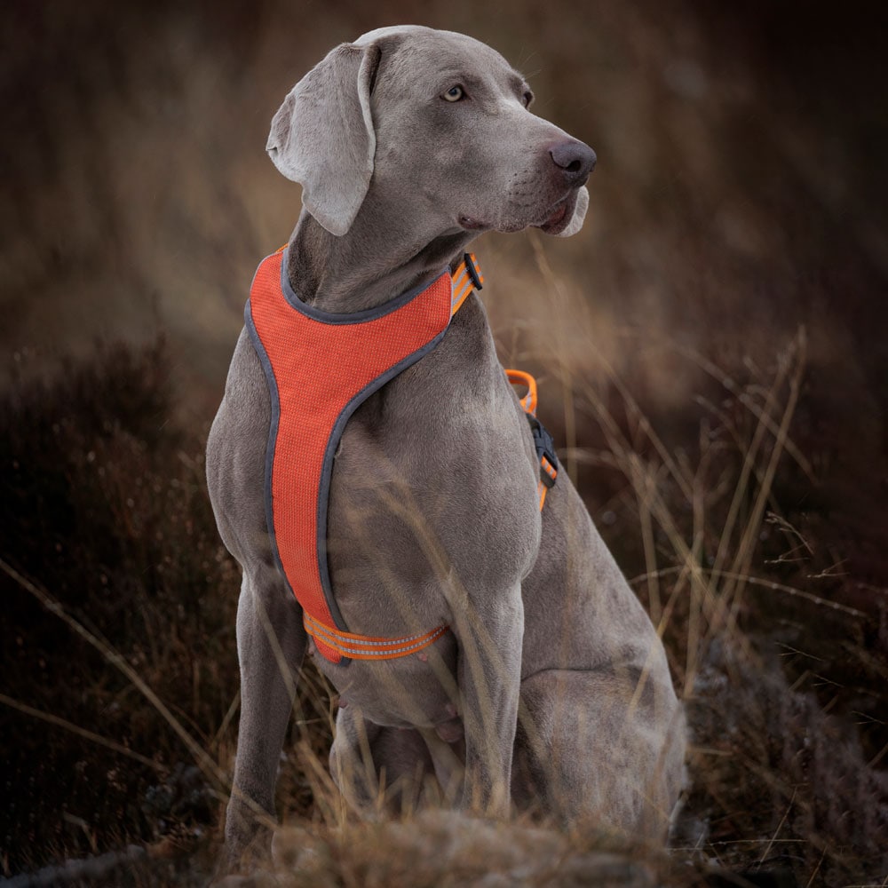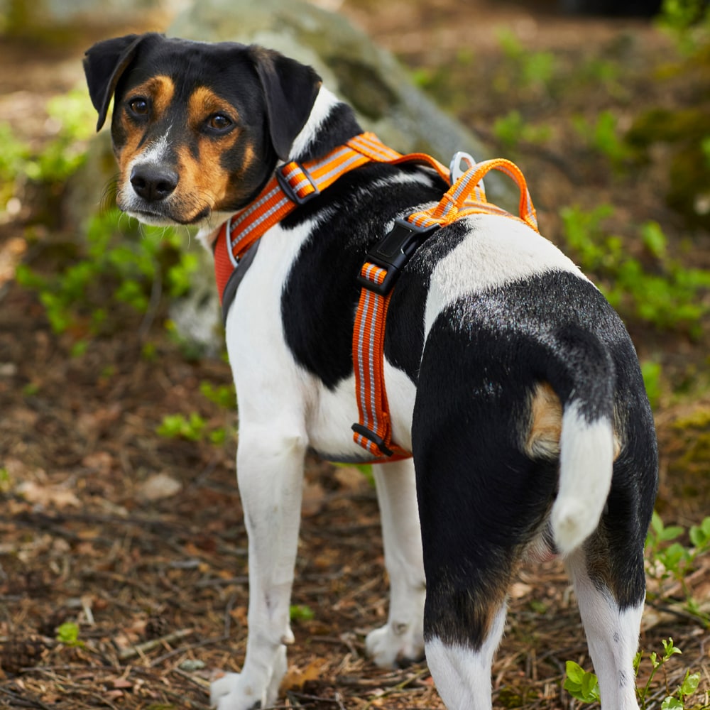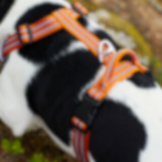 Nylon hondentuigje met reflecterende details. Paneel aan de voorkant met reflecterende draden geweven in stof. Het paneel over de borst is gevoerd met zacht kussengaas. Gemakkelijk verstelbaar rond nek en borst. Handvat op de rug. Bevestiging voor riem.