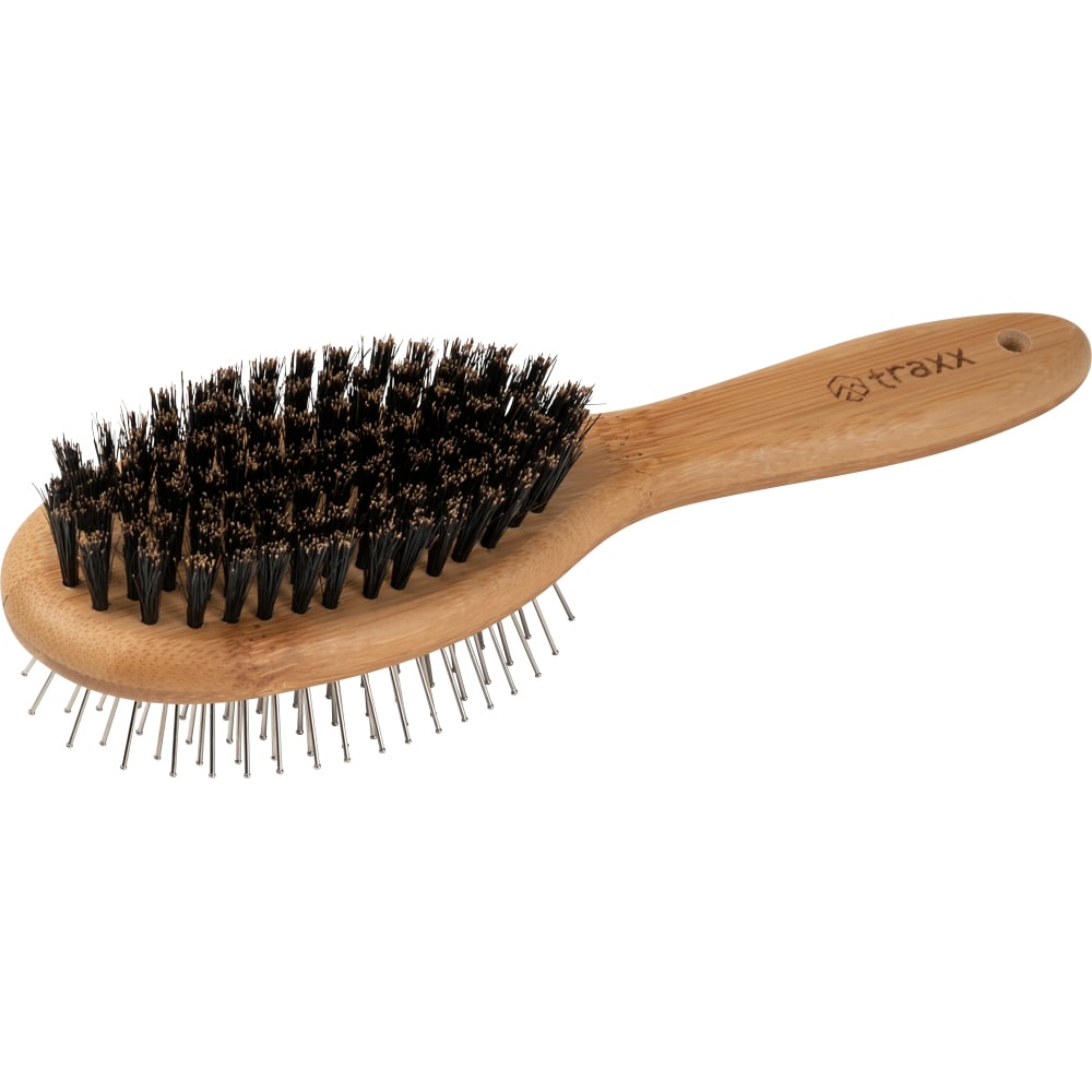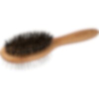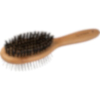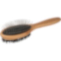 Dubbelzijdige hondenborstel met twee soorten haren. De ene kant heeft nopjes voor het ontwarren van knopen en de andere kant heeft echte varkenshaar. De varkenshaar houdt het haar glanzend en zacht zonder statische elektriciteit te creëren. Het handvat is gemaakt van milieuvriendelijk bamboe. Maat: 22 x 5,5 cm.