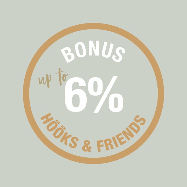 Hööks & Friends heeft vershcillende bonusniveaus; 0%, 2%, 4% en 6%. Afhankelijk van het bonusniveau kunnen bonuspunten in verschillende tempo's worden verzameld. Voor elke 2.000 punten die u verdient, ontvangt u een bonus van EUR 4. Hoe meer u koopt, hoe meer bonus u krijgt