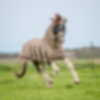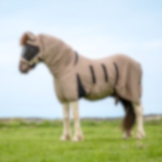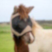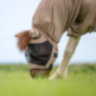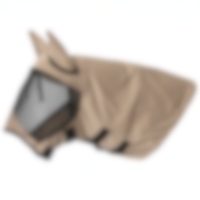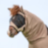 Eczeemmasker van soepel, buigzaam polyester met lichte stretch voor hoog comfort, ademend zodat het paard het niet te warm krijgt, stevig polyester gaas over de ogen en gaten voor de voorpluk zodat de kap niet te strak gaat zitten, volledige oorafdekking