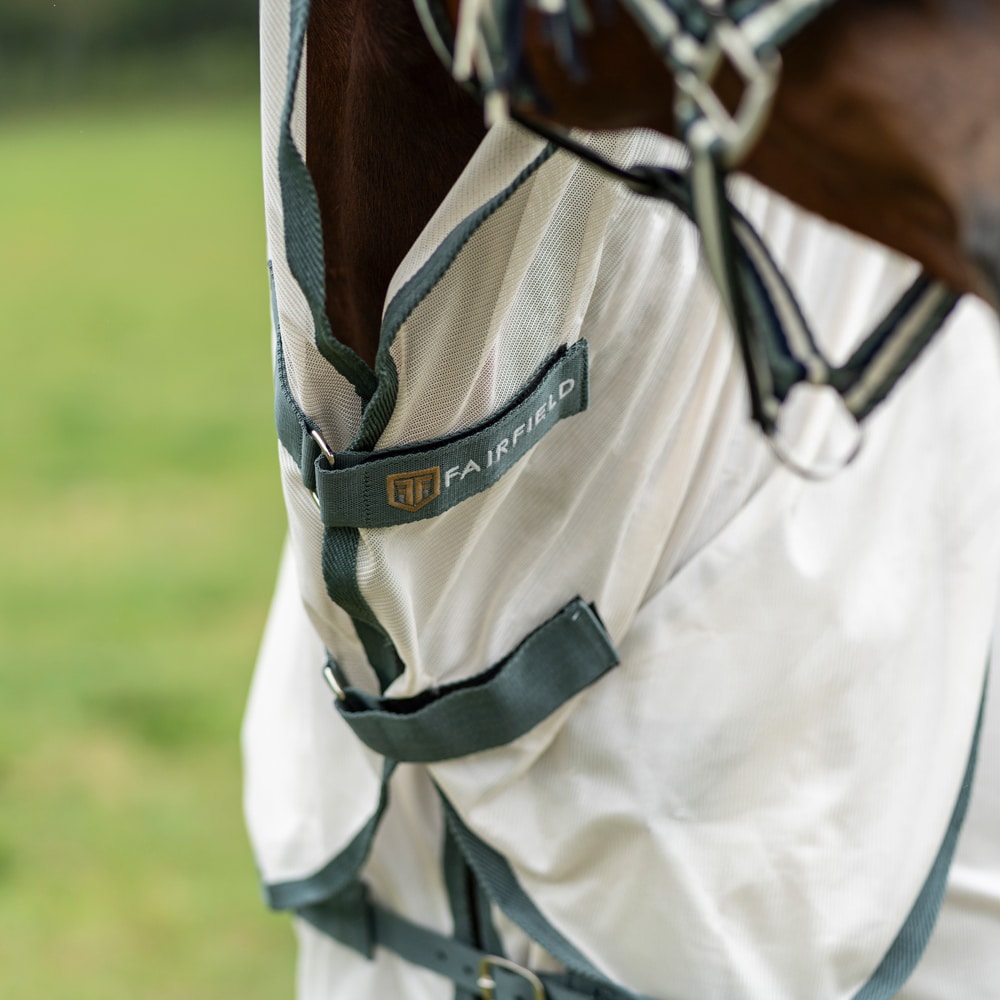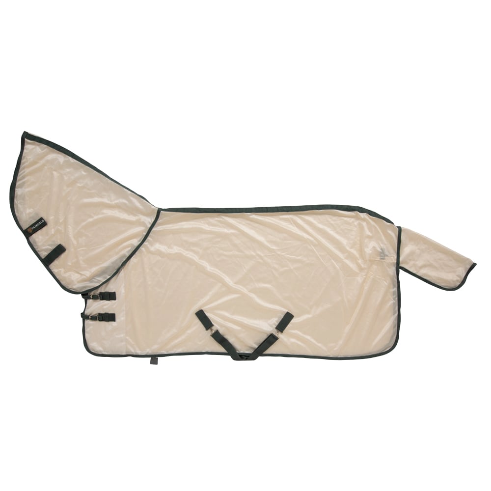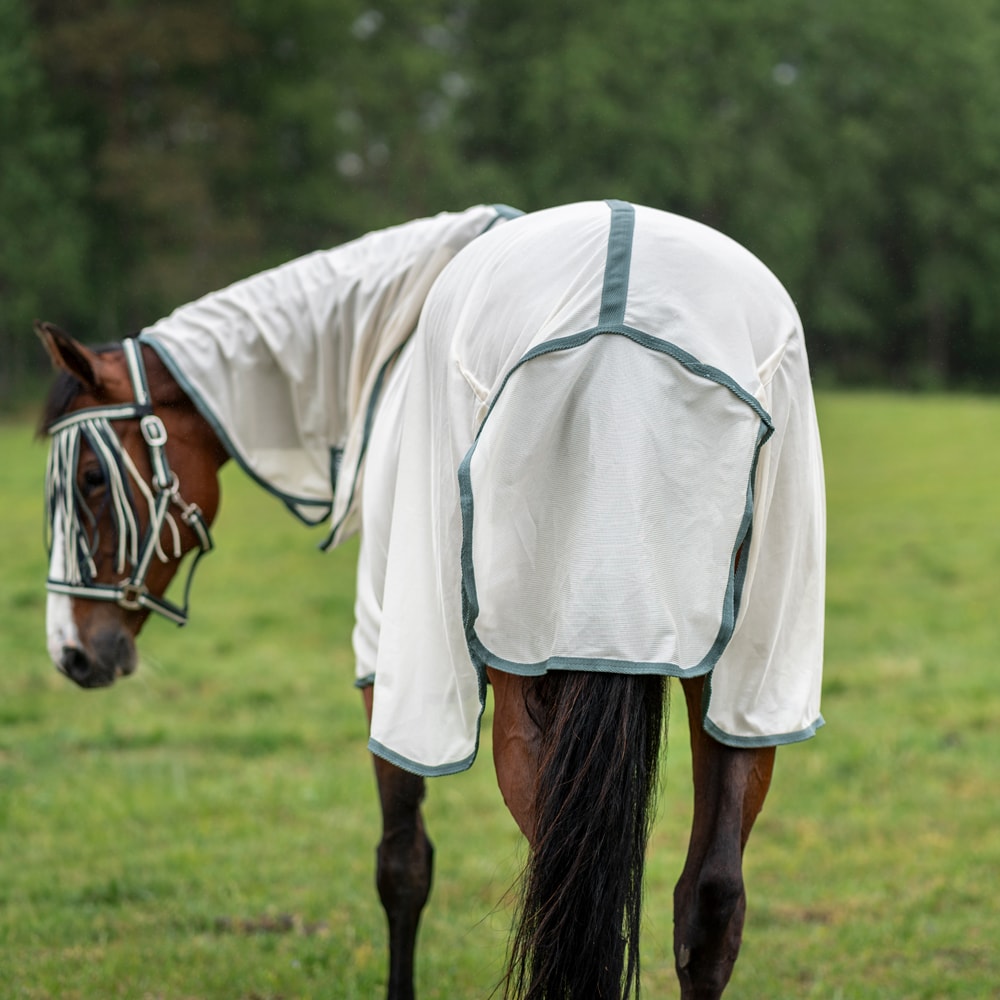 Vliegendeken van fijnmazige polyesternetstof. Nylon voering langs de manen en voor op de buik om het risico op schuren te verminderen. Vaste hals met klittenbandsluiting + bevestiging met rits voor halster. Dubbele sluiting aan de voorzijde en dubbele kruisbanden. Nieuwe kwaliteit klittenband die de meshstof niet beschadigt. Grote staartbeschermer en staartriem.