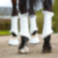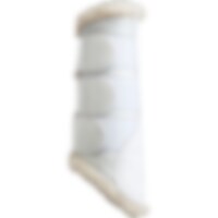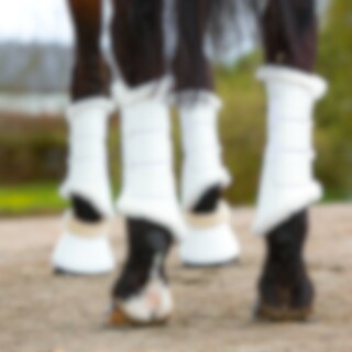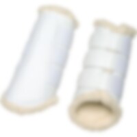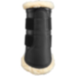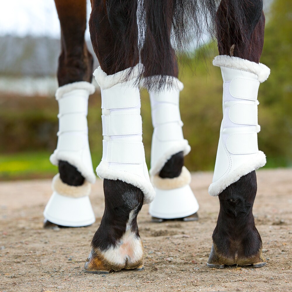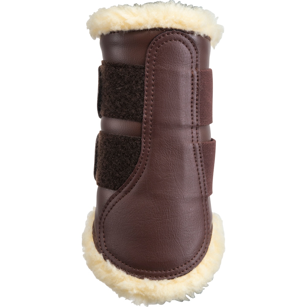 Borstelbeschermers met zachte fleecevoering en imitatieleren buitenzijde. Elastische klittenbandsluiting. Kan zowel op voor- als achterbenen gebruikt worden.