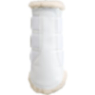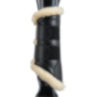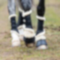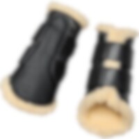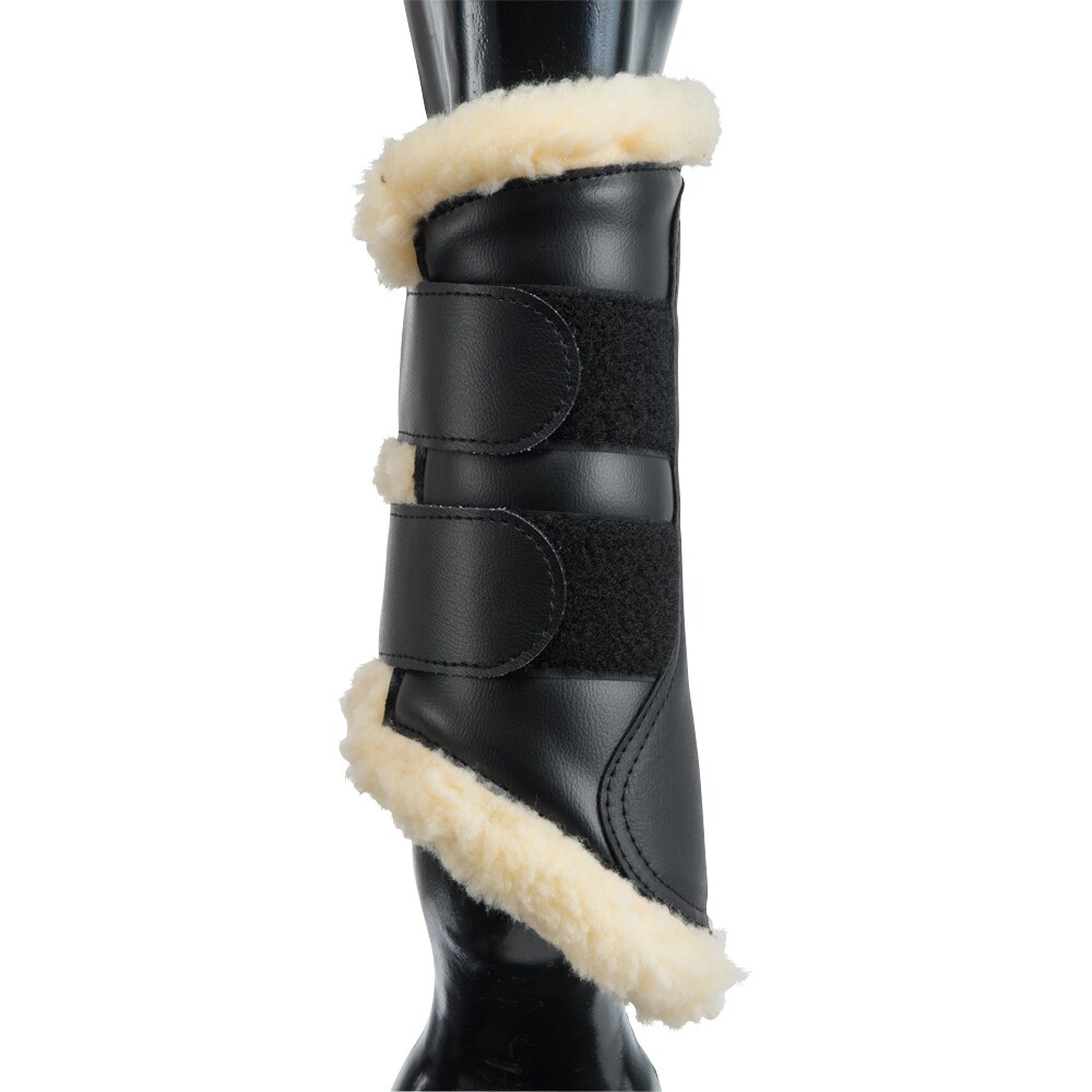 Borstelbeschermers met zachte fleecevoering en imitatieleren buitenzijde. Elastische klittenbandsluiting. Kan zowel op voor- als achterbenen gebruikt worden.