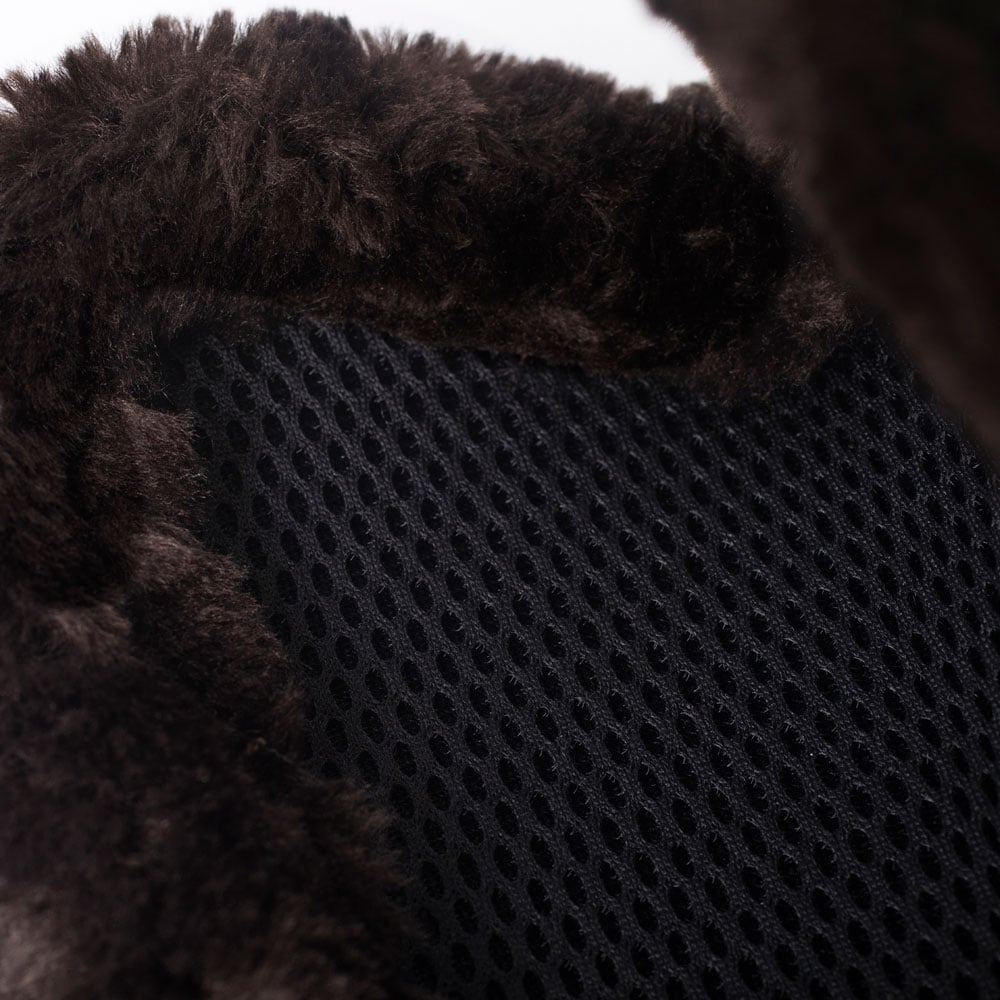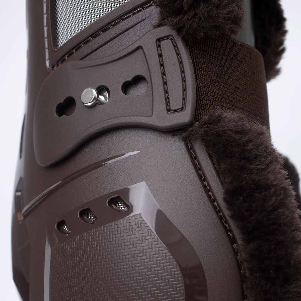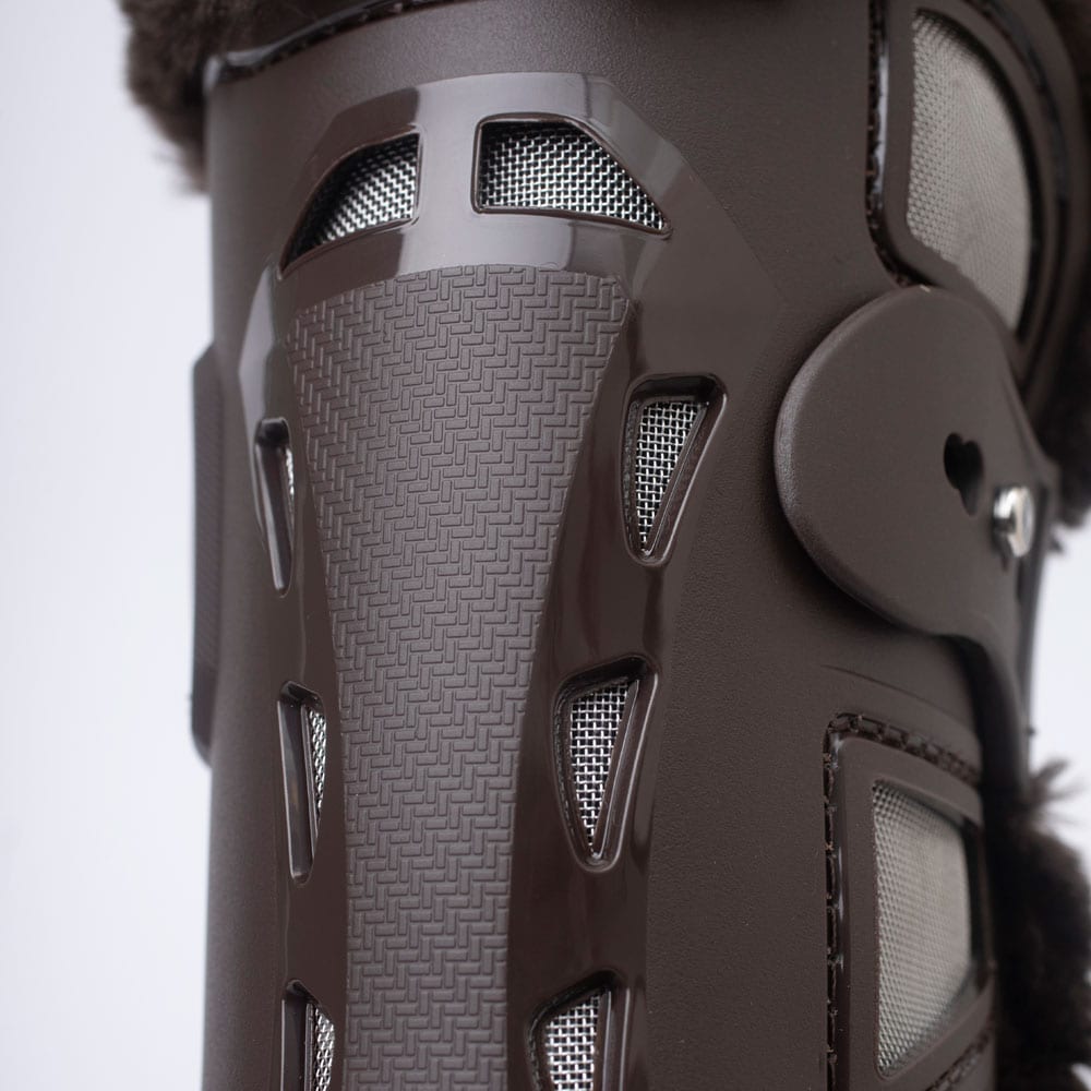 Technische beenbescherming met ventilerende gedeelten om te voorkomen dat de zenuwen oververhit raken. Rand van namaakbont om te voorkomen dat gruis en zand in de bescherming komen. Binnenzijde van mesh. Elastische sluiting.