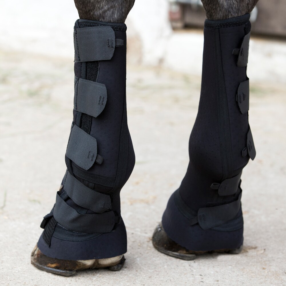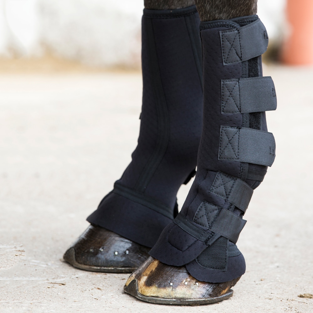 Zachte veiligheidslaarzen van elastisch, geventileerd neopreen. Bedek tot aan de periople en een klein beetje op de hoef. Helpt de benen schoon en moddervrij te houden en biedt bescherming tegen stoten, vleeswonden en overstrekken. Mag niet langer dan 12 uur per dag worden gebruikt. Tussen gebruik verwijderen, reinigen en drogen.