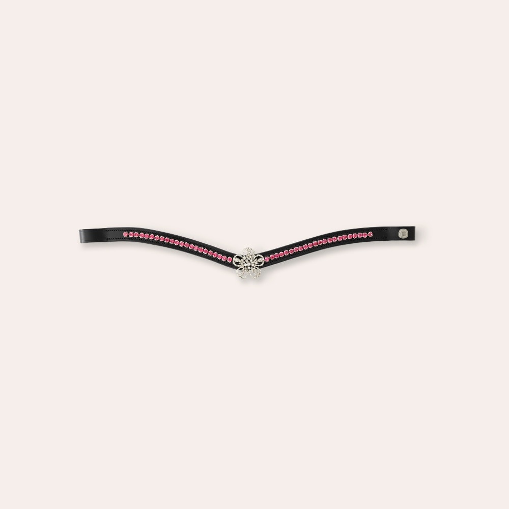 Gebogen frontriem versierd met witte steentjes en een grote bloem in het midden. Let op: de hoofdband kan scherp en kwetsbaar zijn.