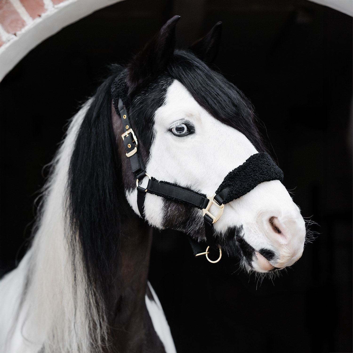 Halster met zachte pilé bij de neus, nek en de verstelbare zijstukken. Goudkleurige gespen.