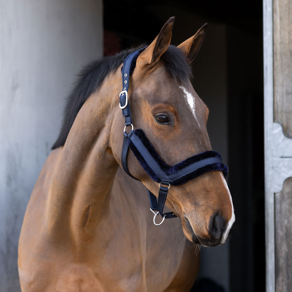 Halster gevoerd met minky fleece bij de neus, nek en zijstukken. Breed gevormd nekstuk, gebogen neusstuk, verstelbaar aan beide zijden van de nek en onder de neus.