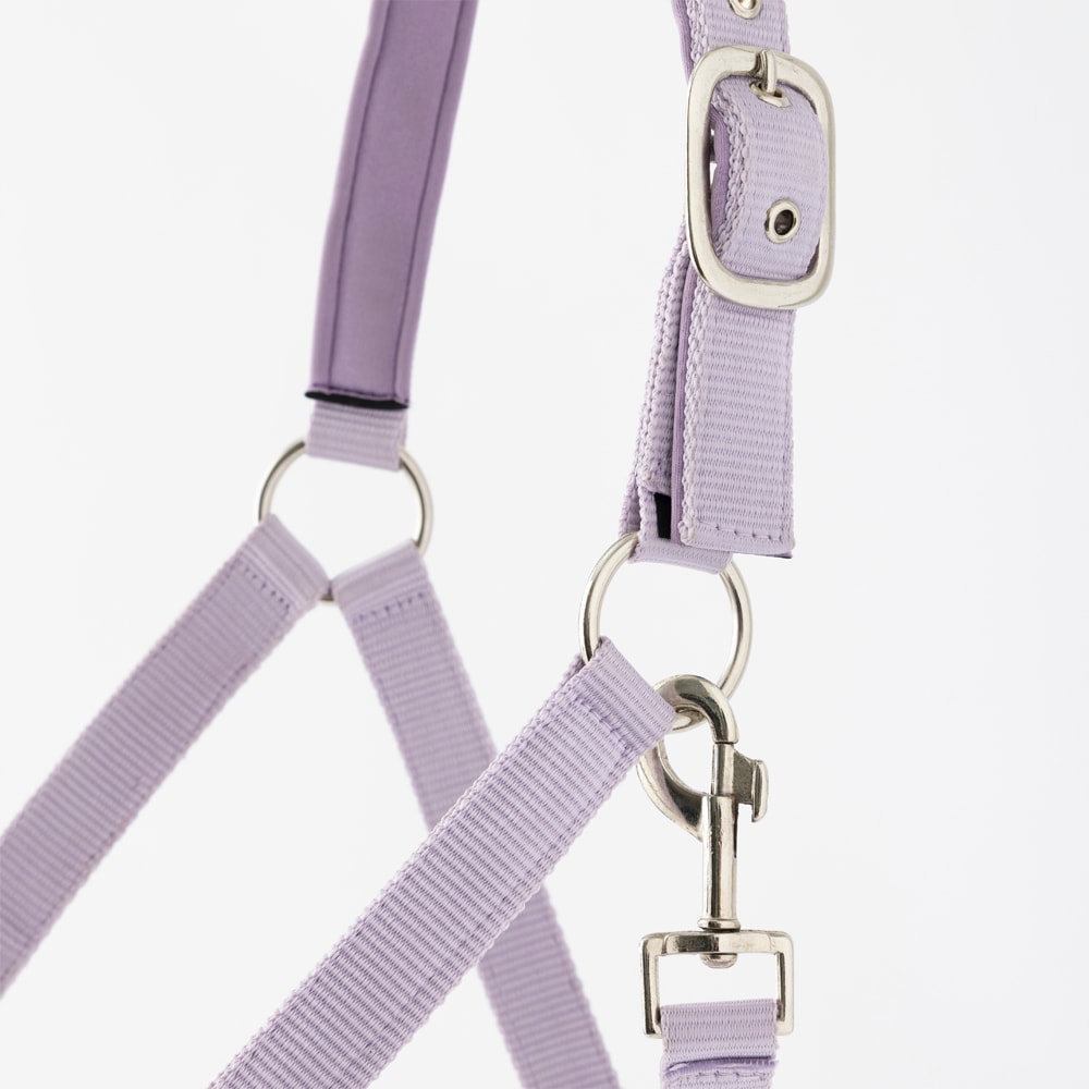 Halster met zachte neopreen voering bij de neus en nek. Tekst op neus. Paars - Schattig, Saliegroen en Rookblauw - Super Star.