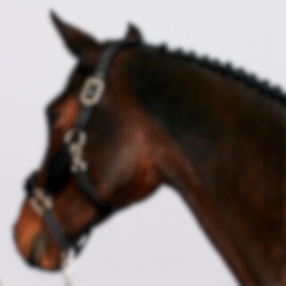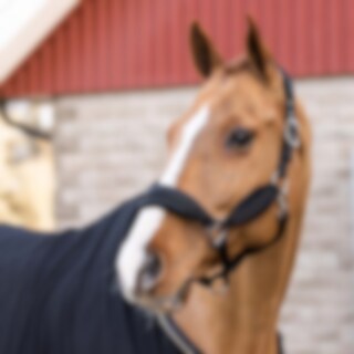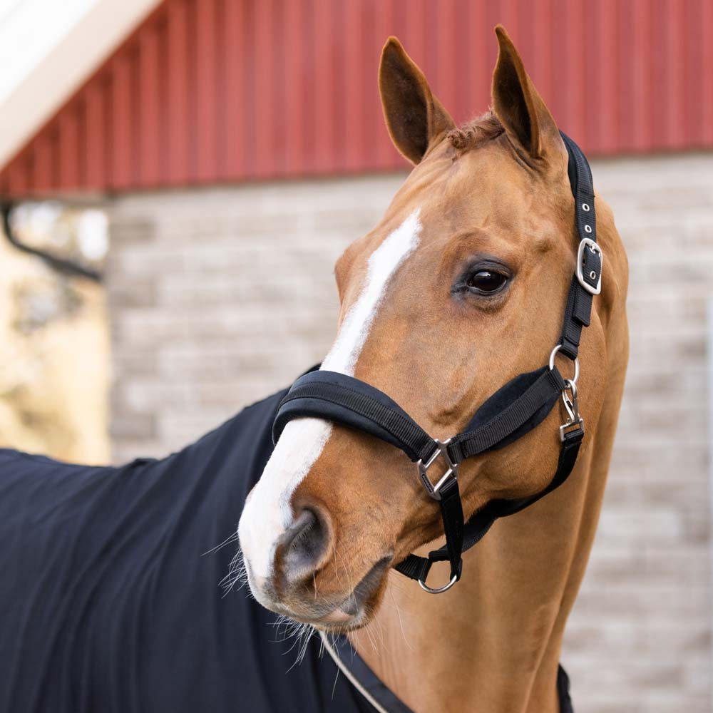 Halster met zachte vulling van fluweel bij de nek-, neus- en zijstukken. Verstelbaar aan beide zijden van de nek.