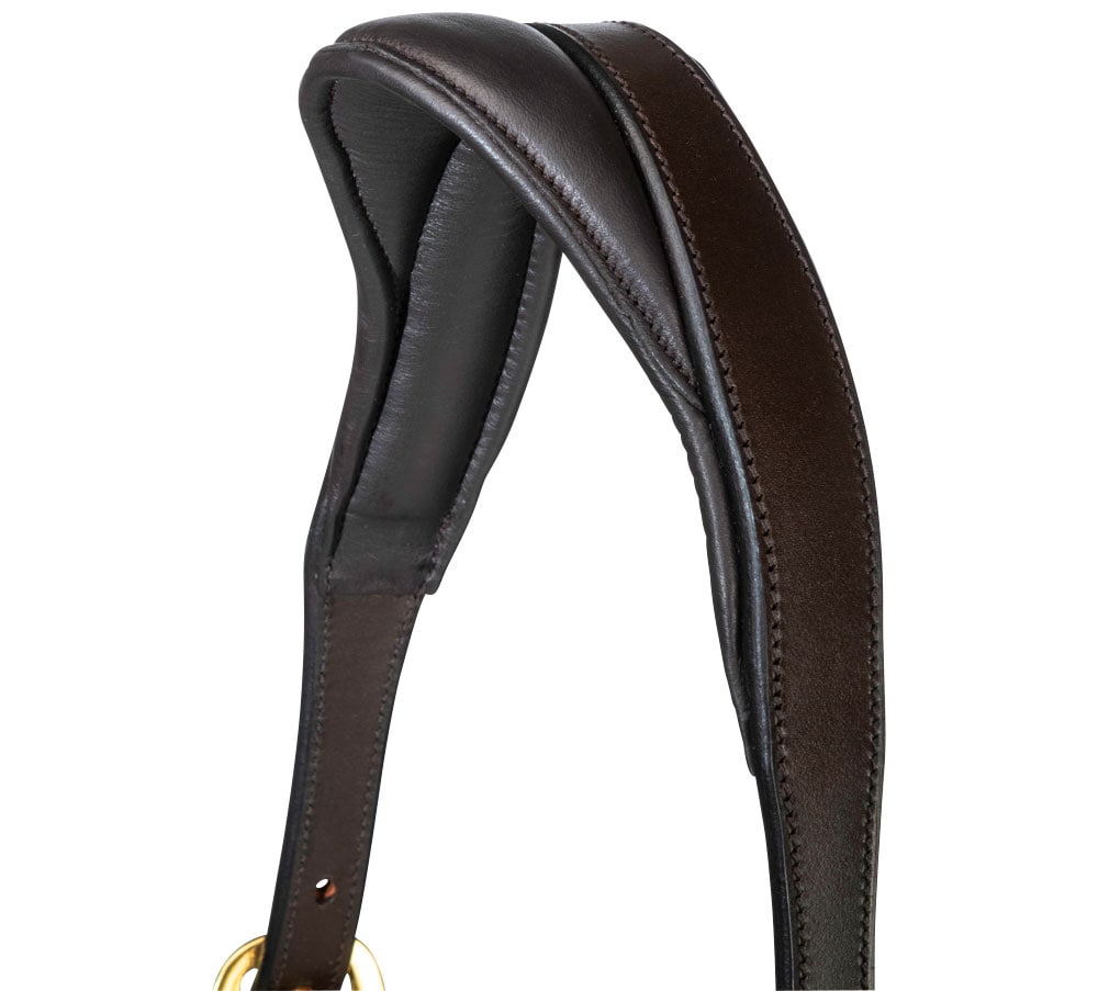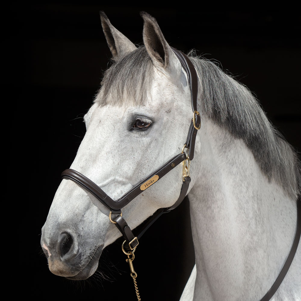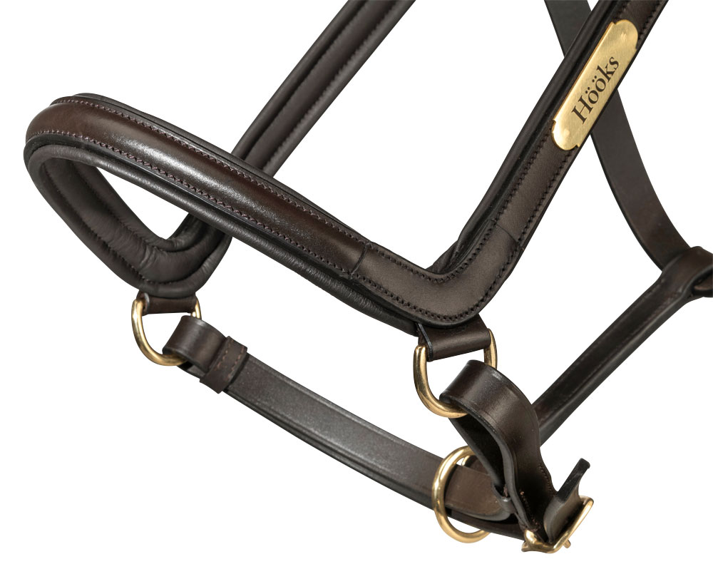 Leren halster met breed en zacht anatomisch gevormd nekstuk. Zachte voering bij de neus en zijstukken. Naamplaatje met HÖÖKS, gespen aan beide zijden van de nek en verstelbaar onder de neus.