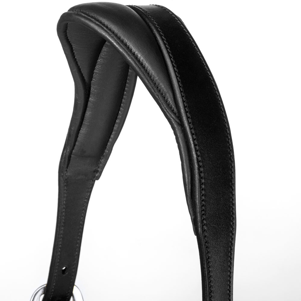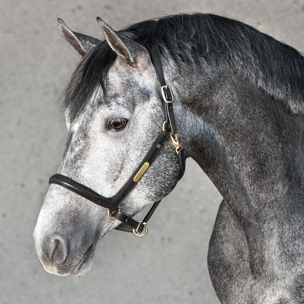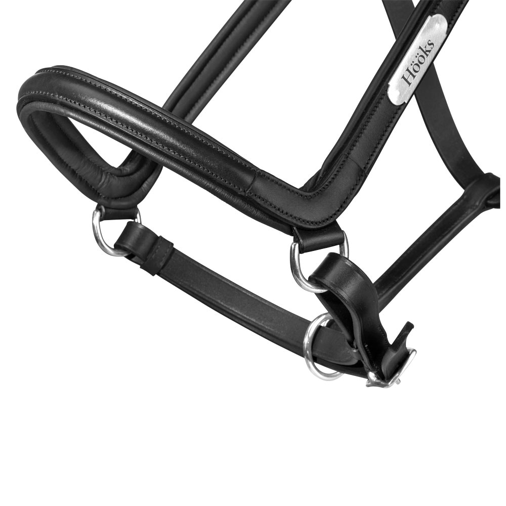 Leren halster met breed en zacht anatomisch gevormd nekstuk. Zachte voering bij de neus en zijstukken. Naamplaatje met HÖÖKS, gespen aan beide zijden van de nek en verstelbaar onder de neus.