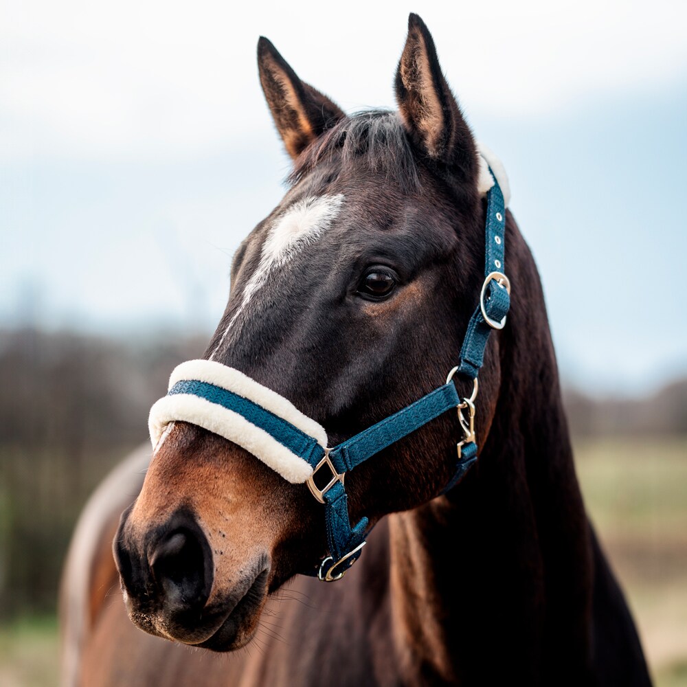 Halster gevoerd met zachte minky fleece in de nek-, neus- en zijstukken. Verstelbaar aan beide zijden van de nek en onder de neus. Donkerbeige halster heeft rosé-kleurige gespen. Marineblauw halster heeft zilverkleurige gespen.