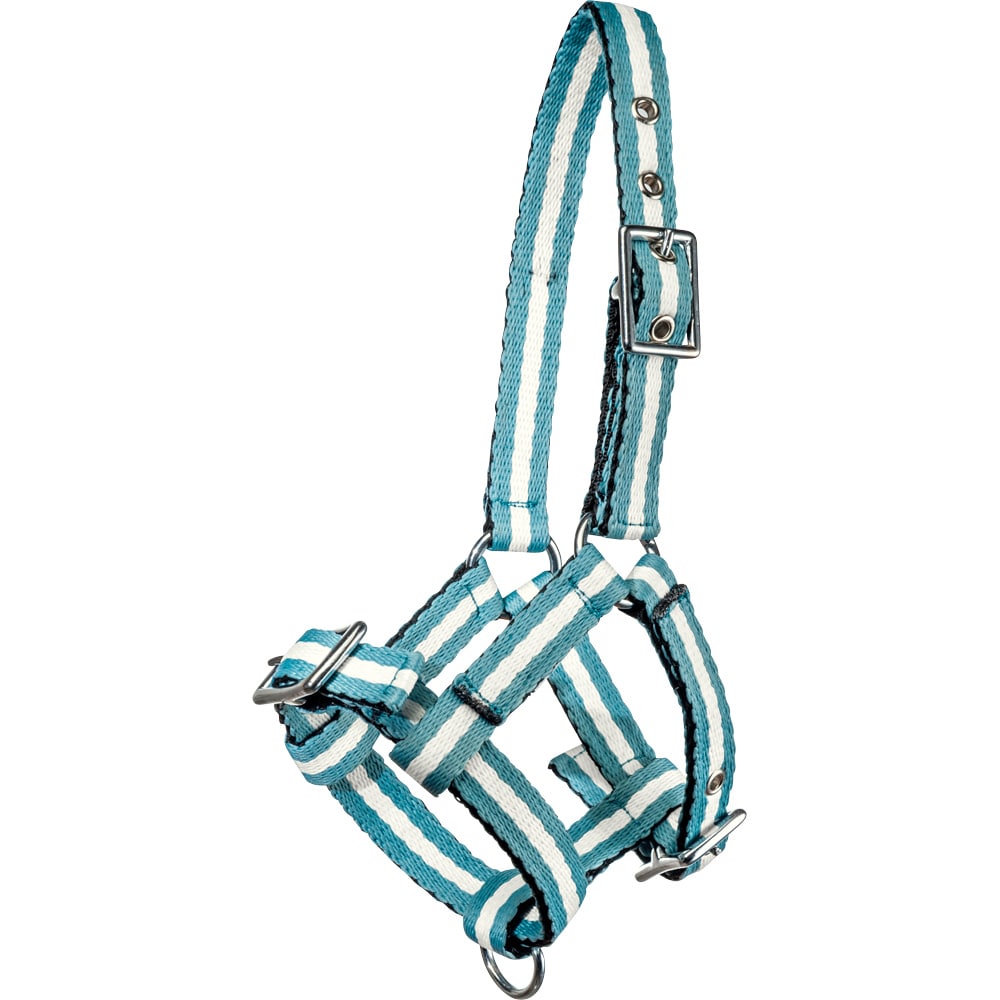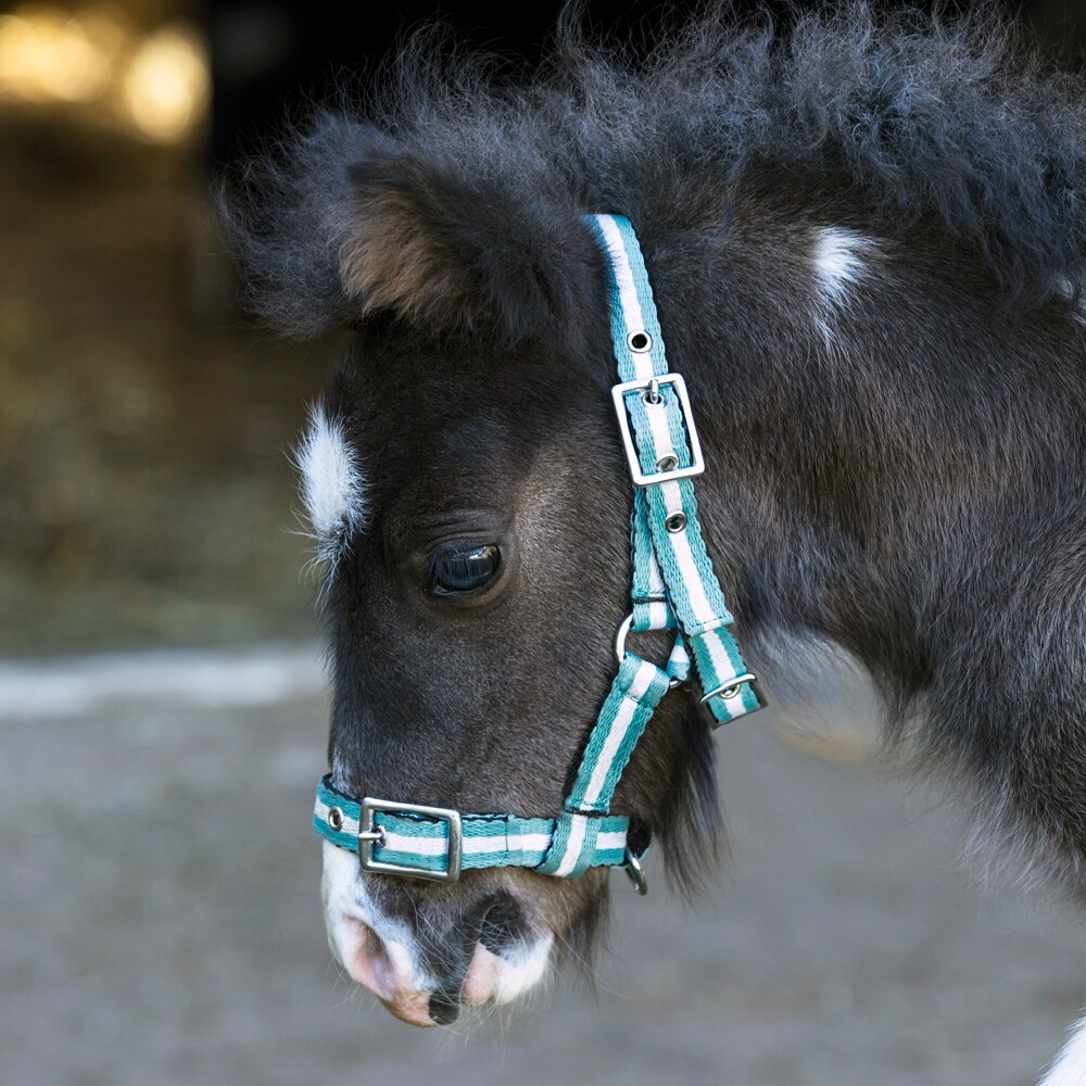 Zacht dubbelgestikt kussenband voor het kleinste veulen. Verstelbaar hoofdstuk, wangen en neus. Zilverkleurige gespen.