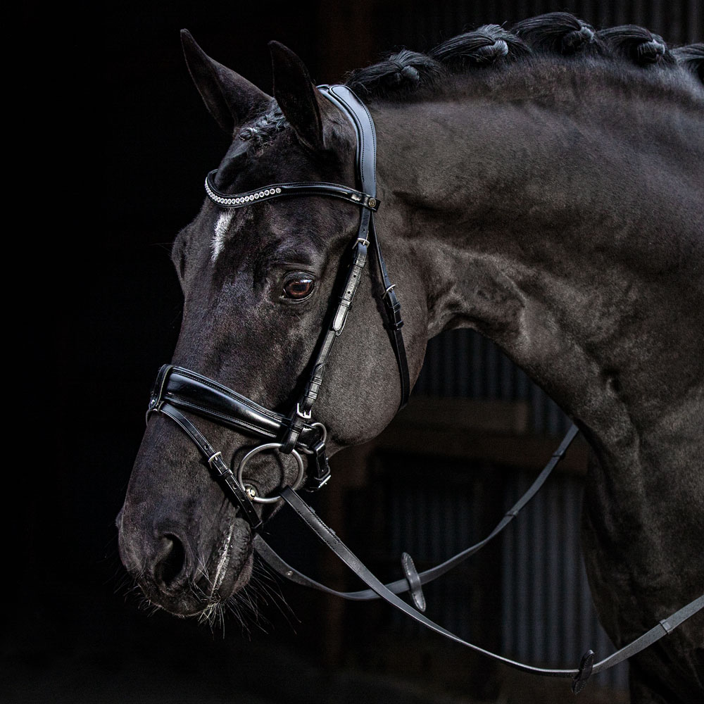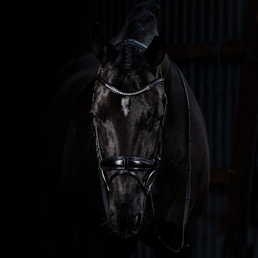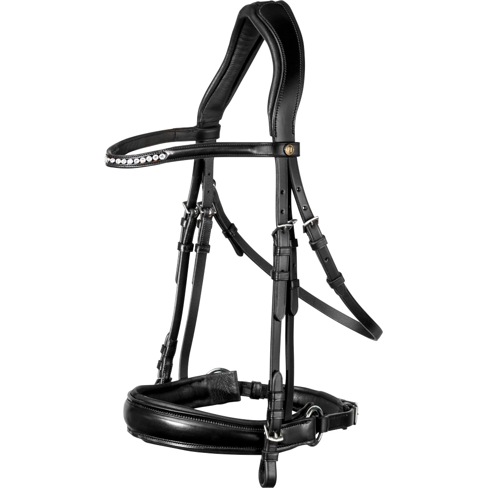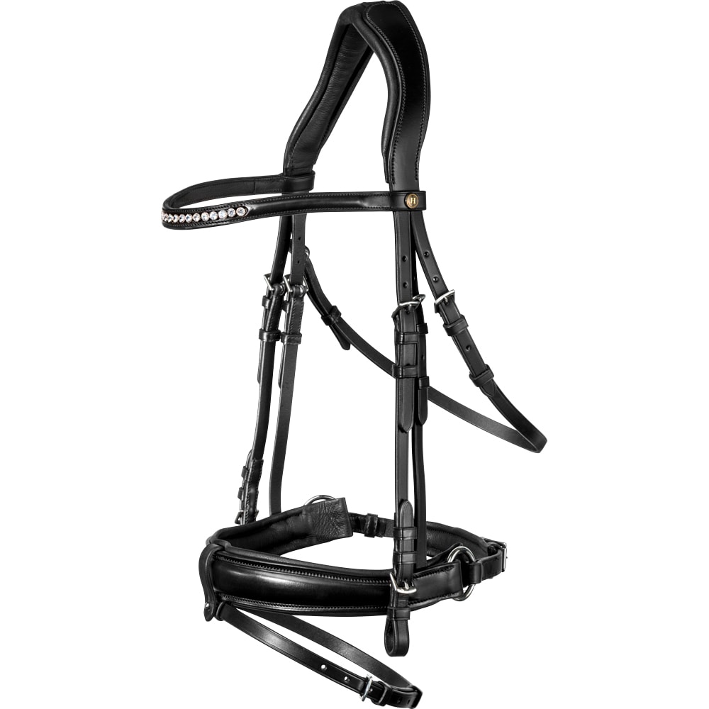 Gecombineerd neusriem hoofdstel van Italiaans leer met 4,5 cm brede onderlegde neusriem. Volledig afneembare Aachen-riem. Gebogen halsstuk met zachte voering en gebogen frontriem met witte stenen.