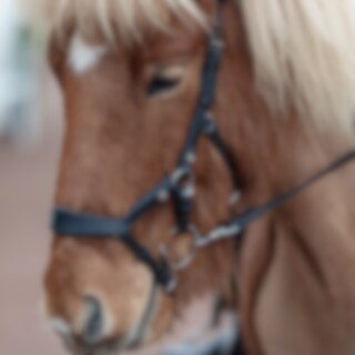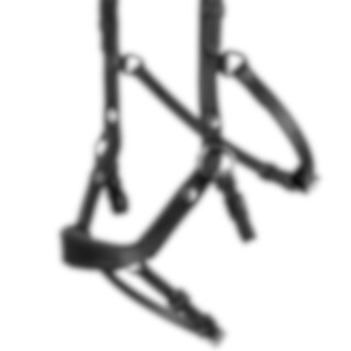 Hoofdstel met gebogen, zacht onderlegde neusriem ontworpen om druk op gevoelige gebieden te voorkomen. Anatomisch gevormd kroonstuk met een uitgesneden gedeelte in het midden. Het bit is bevestigd aan een verstelbare leren riem. Gebogen gevoerde frontriem. Zonder keelriem.