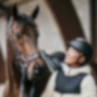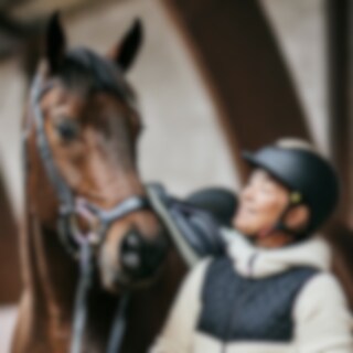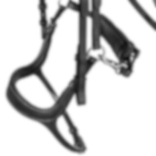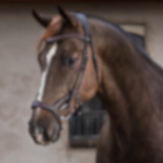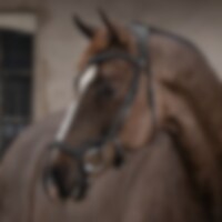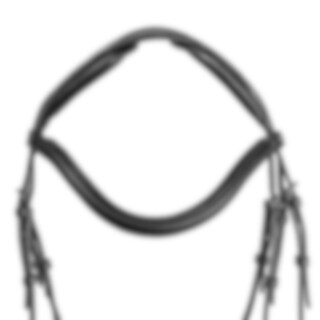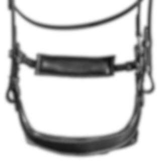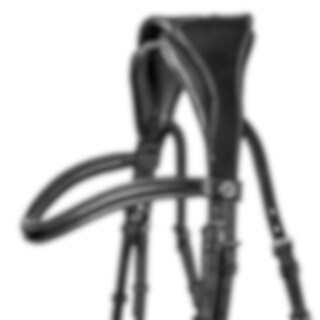 Hoofdstel met breed kopstuk en zachte vulling, ontworpen om de druk op de paardennek te verminderen. Snelsluiting onder de bek met een beweegbaar paneel, in hoogte en lengte verstelbaar. Extra vulling op de neusbrug. Gebogen frontriem met zachte voering.