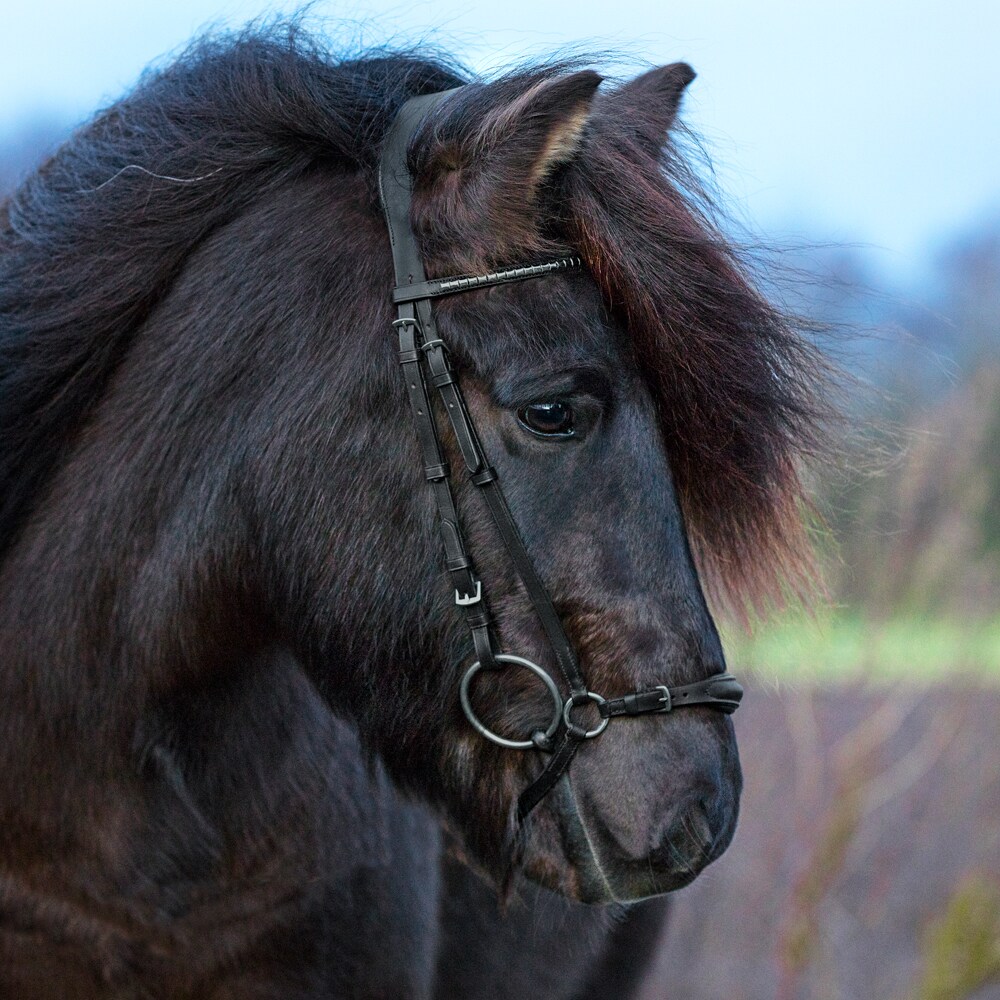IJslands hoofdstel met breed gebogen hoofdstuk. Verstelbare lage neusriem met zachte voering. frontriem met zilverkleurige clinchers.