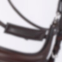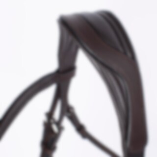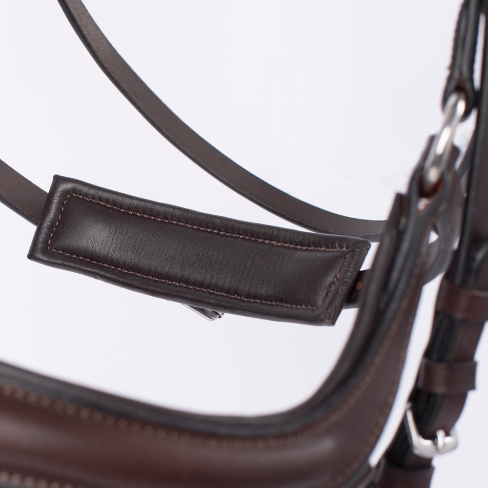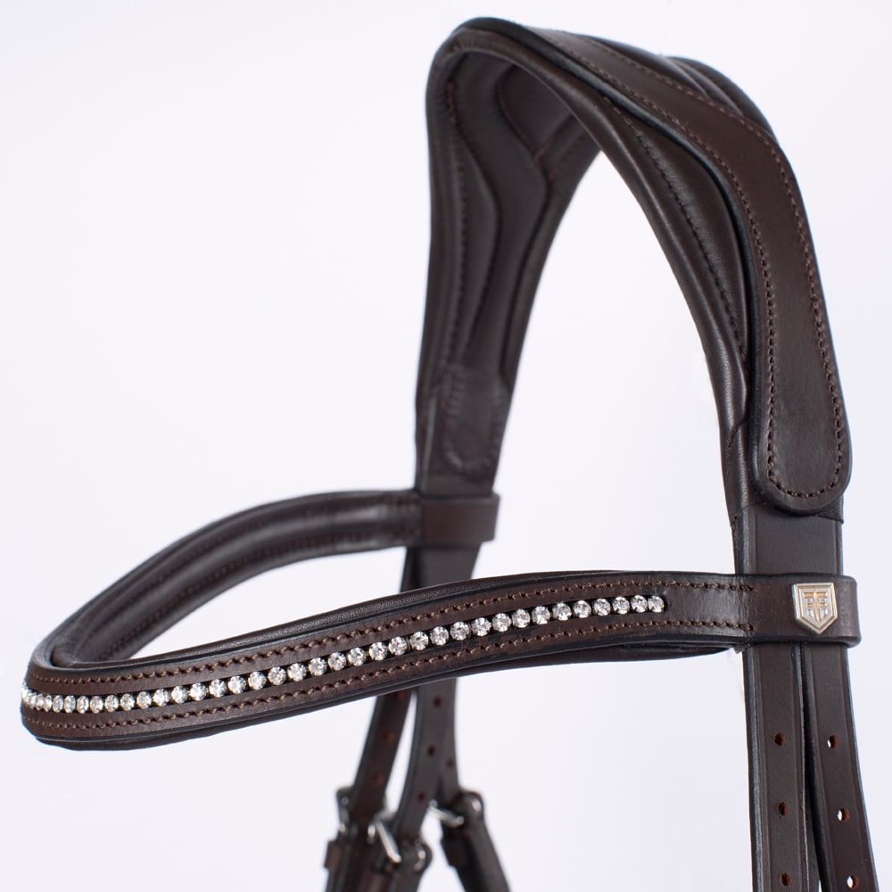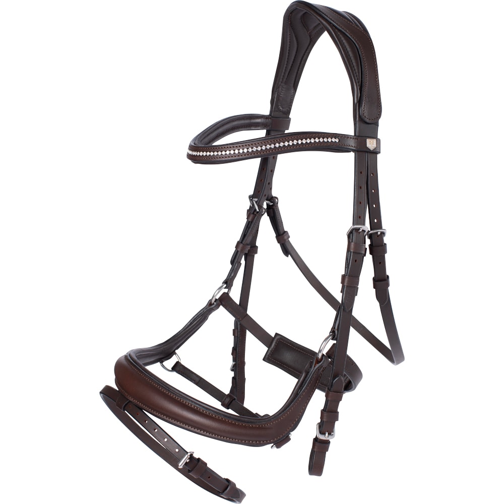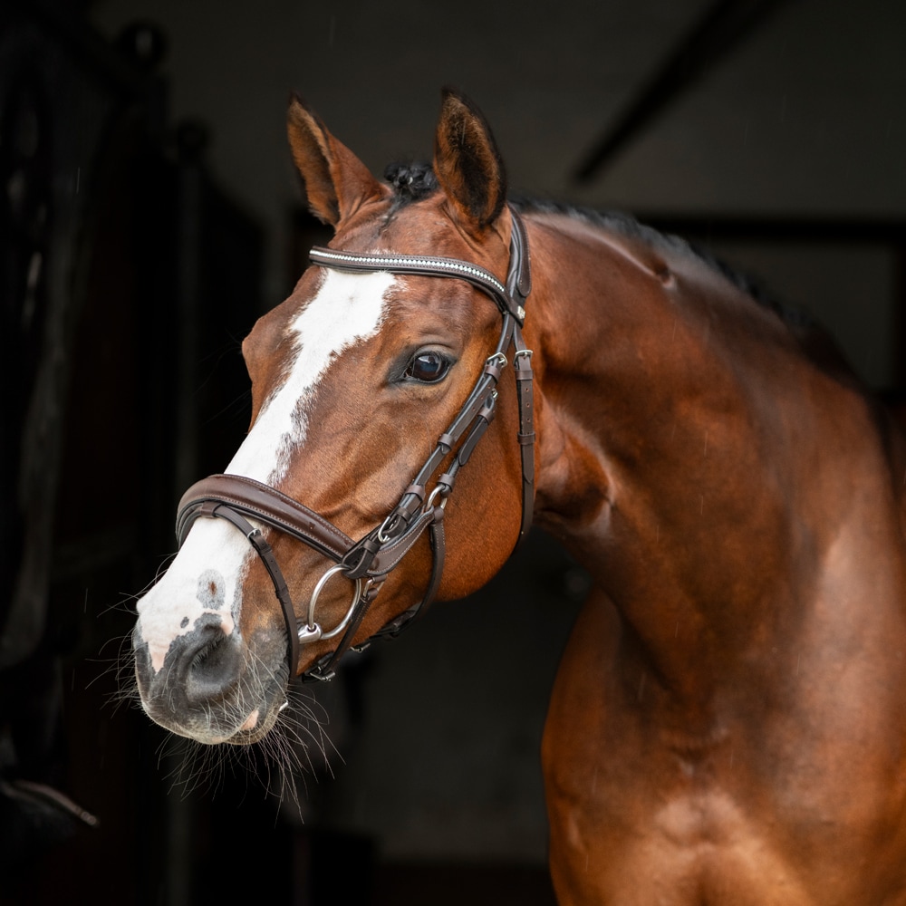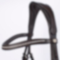 Aachen-trens met voorgevormde, gevoerde neusriem. Zit stevig dankzij de gesp op de onderkaak en de klassieke kaakriem. Breed, voorgevormd nekgedeelte met uitgesneden deel van extra zacht leer. Gebogen gevoerde hoofdband met witte steentjes.
