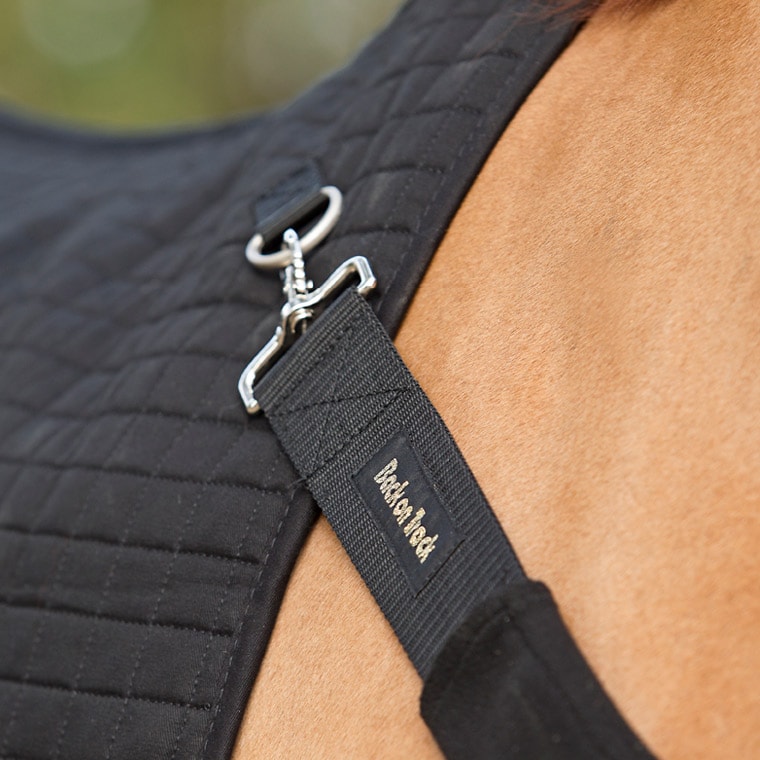 Verstelbaar tuig dat de Back on Track-rugwarmer op zijn plaats houdt. Gemakkelijk te bevestigen aan de ringen op de rugwarmer. Compatibel met Back on Track rugwarmer art.nr. 600606.