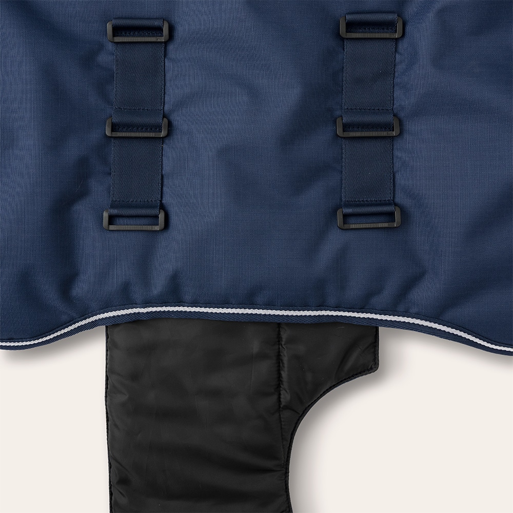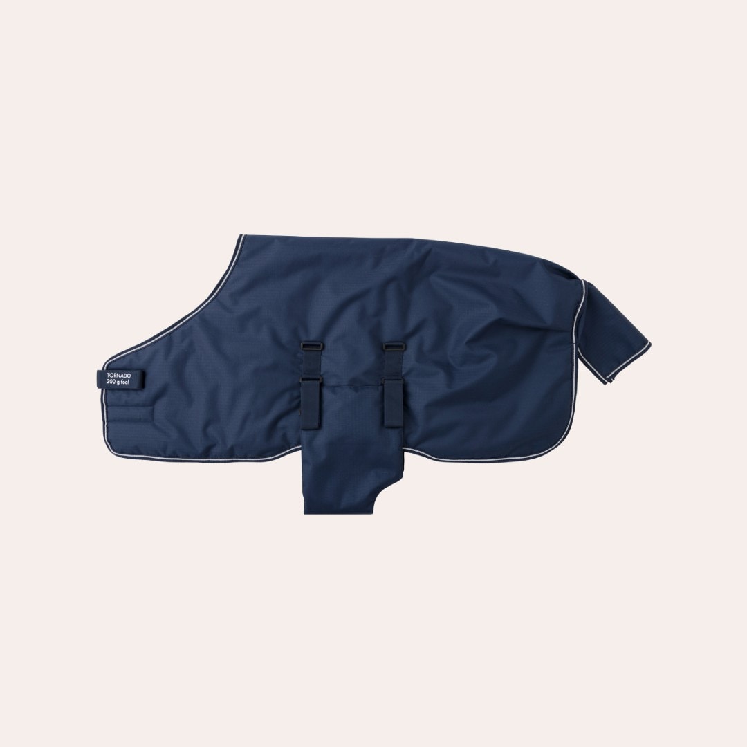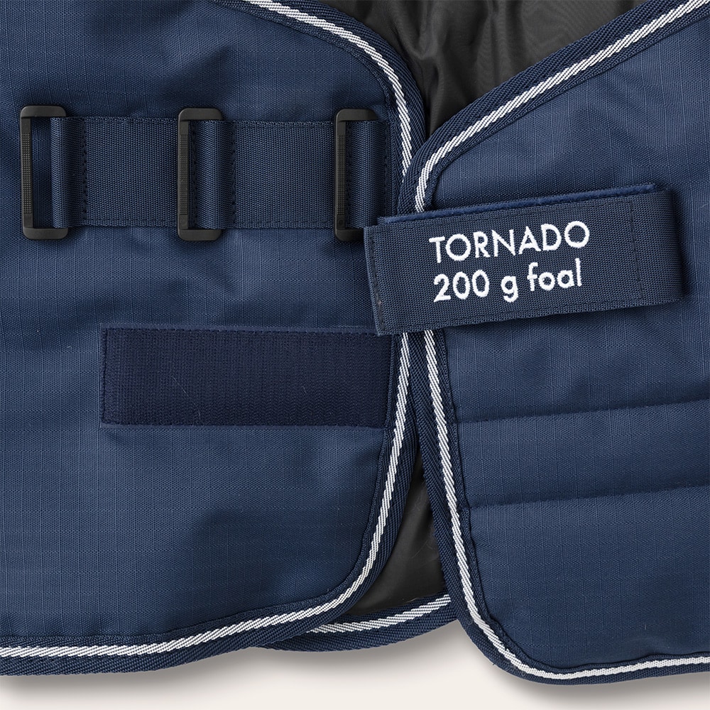 Veulendeken van 600D polyester ripstop met 200 g vulling. Je kunt de deken aan de voorkant ongeveer 15 cm verstellen, zodat je hem om de buik kunt aanpassen naarmate het veulen groeit. De maat geeft de ruglengte van de deken aan. Buikplaat om de warmte vast te houden en staartriem om de deken op zijn plaats te houden.
