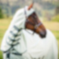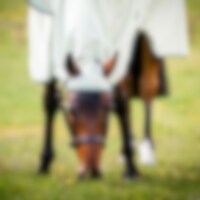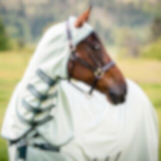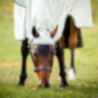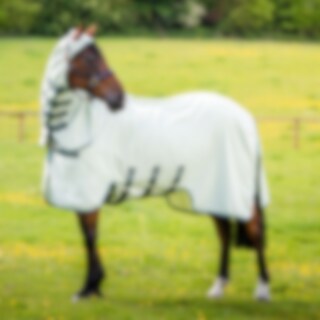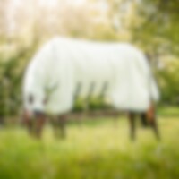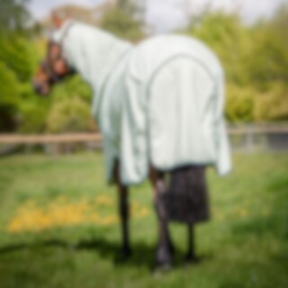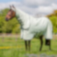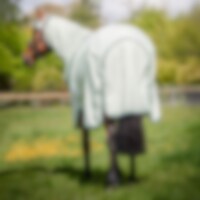 Slijtvaste eczeemdeken van Horseware met speciaal halsstuk dat over de oren gaat om het op zijn plek te houden. De deken wordt bevestigd met drie banden onder de buik.