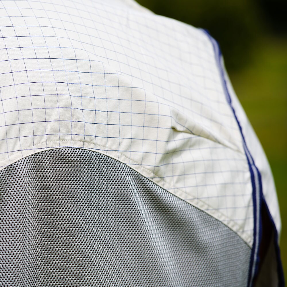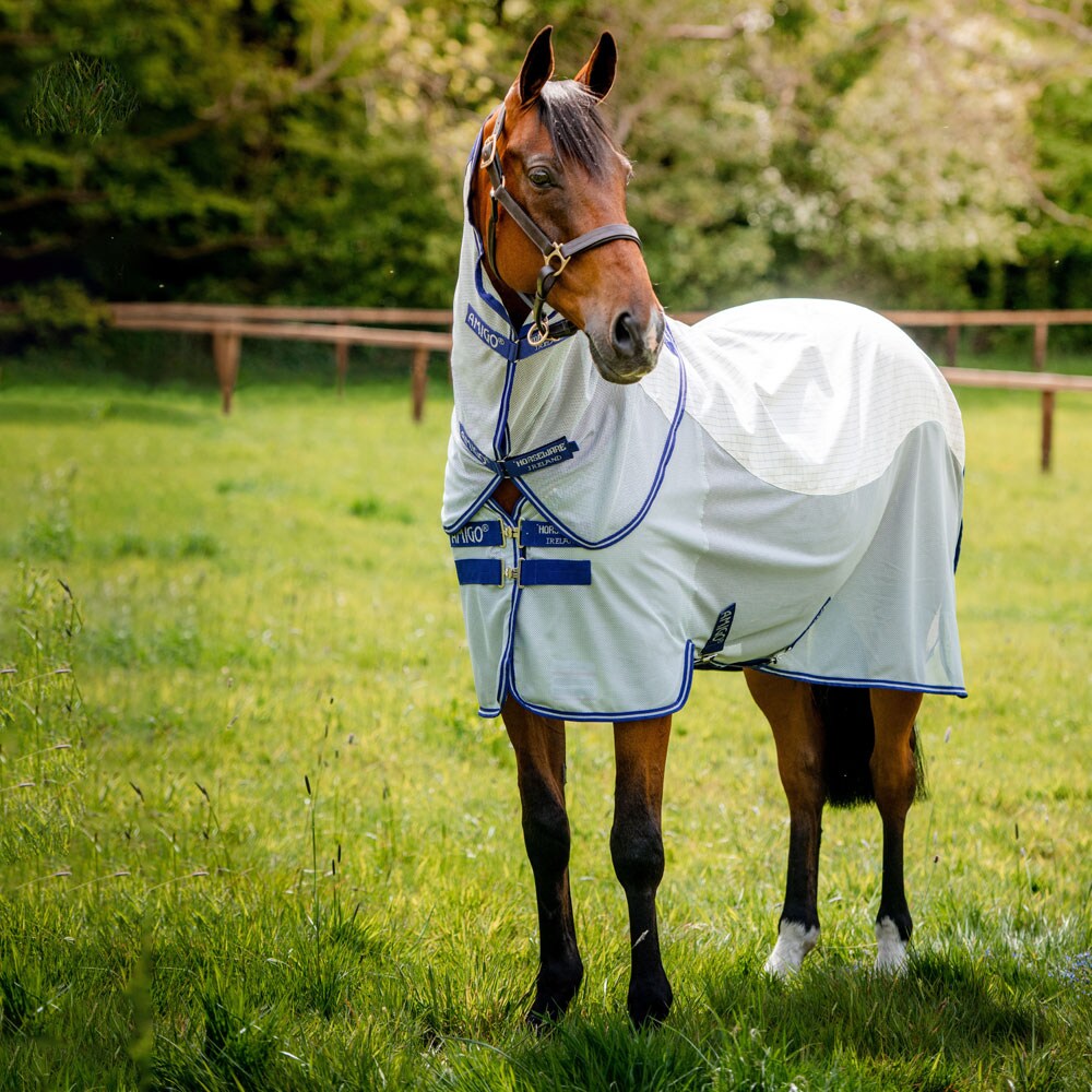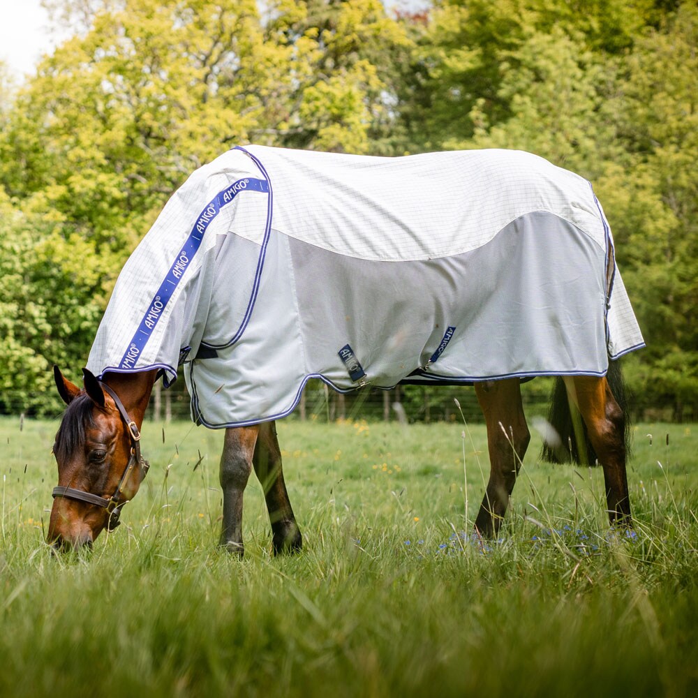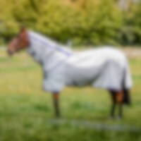 De ultieme zomerdeken met rugdeel van stevige, geruite katoen/polyester die beschermt tegen UV-straling van de zon (60-70%) en tegen lichte zomerbuitjes. Lichtgewicht polyestermesh aan de zijkanten beschermt tegen insecten en geeft tegelijkertijd goede ventilatie zodat het paard ook op warme dagen koel blijft. Grote staartbescherming en Horsewares gepatenteerde beenuitsparing voor goede bewegingsvrijheid.
