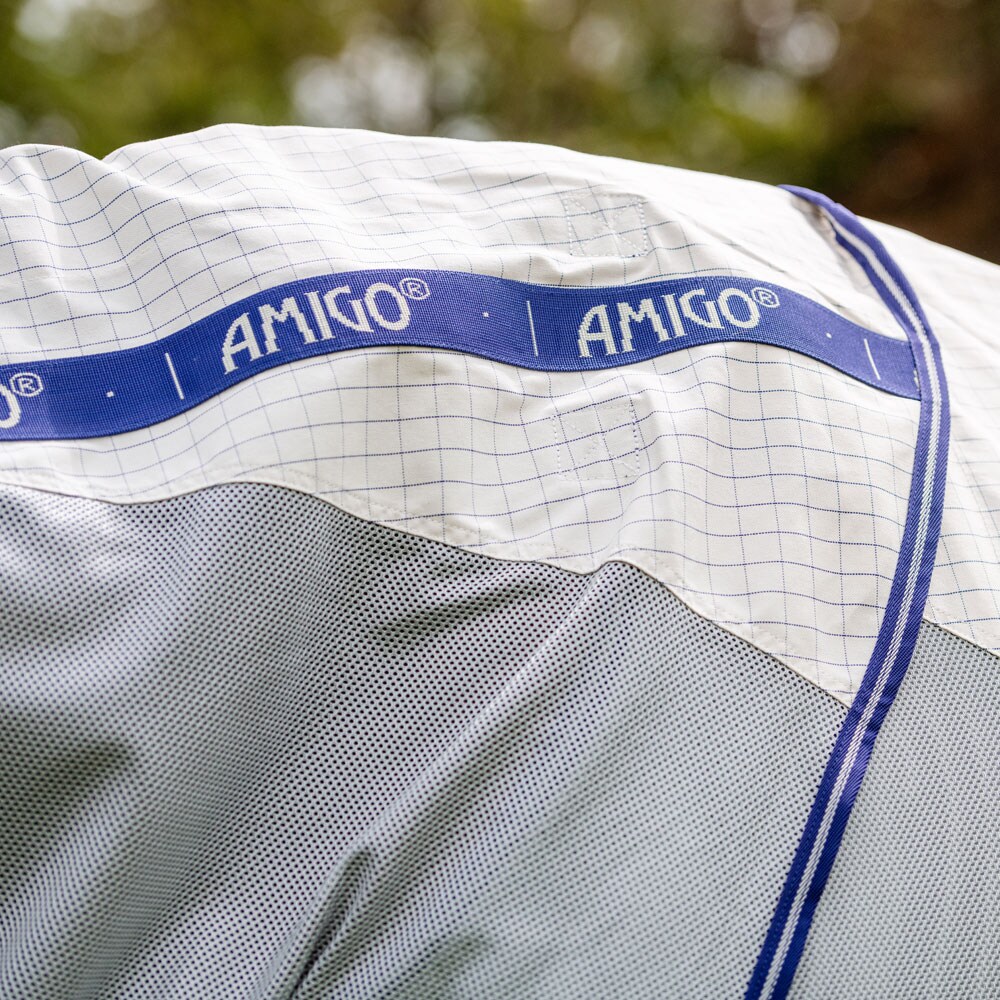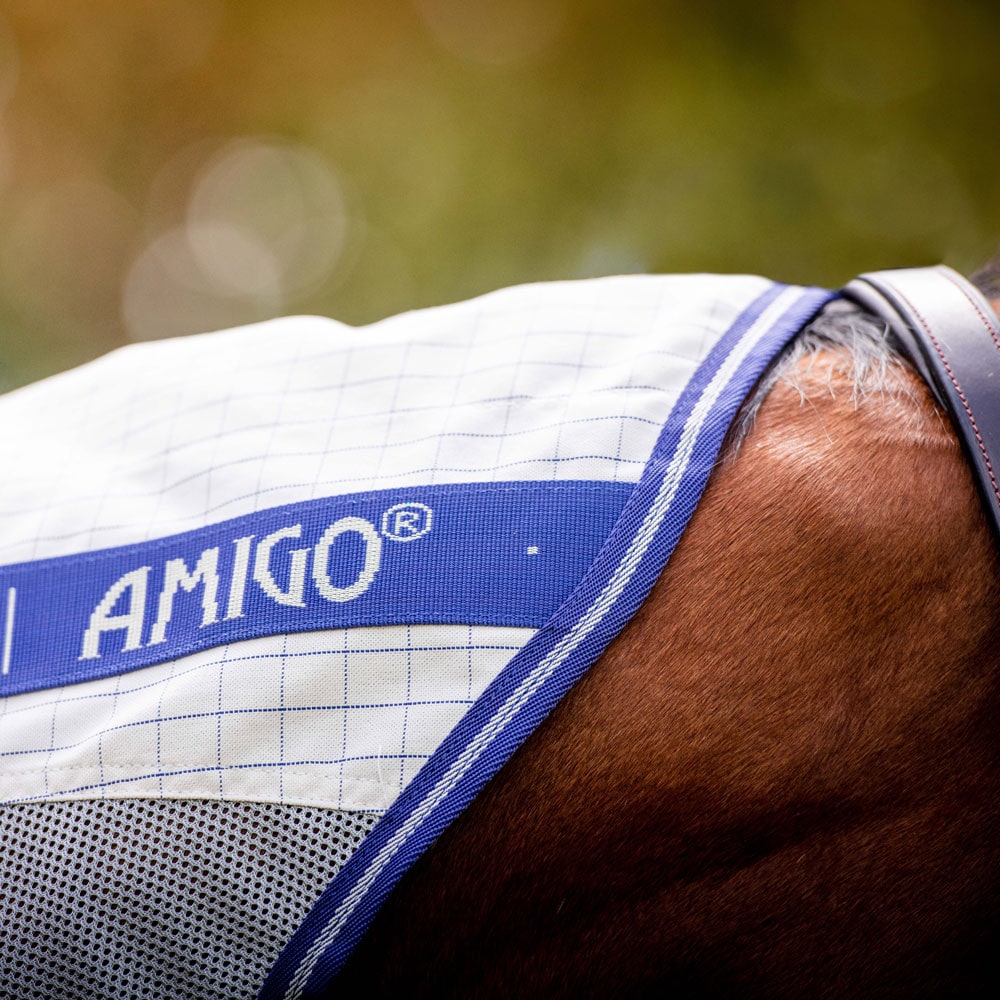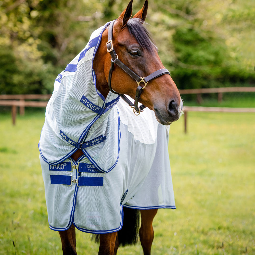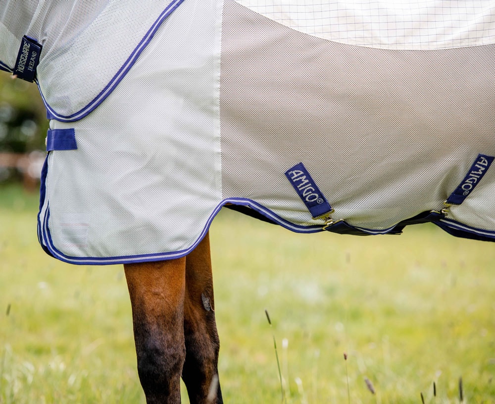 De ultieme zomerdeken met rugdeel van stevige, geruite katoen/polyester die beschermt tegen UV-straling van de zon (60-70%) en tegen lichte zomerbuitjes. Lichtgewicht polyestermesh aan de zijkanten beschermt tegen insecten en geeft tegelijkertijd goede ventilatie zodat het paard ook op warme dagen koel blijft. Grote staartbescherming en Horsewares gepatenteerde beenuitsparing voor goede bewegingsvrijheid.
