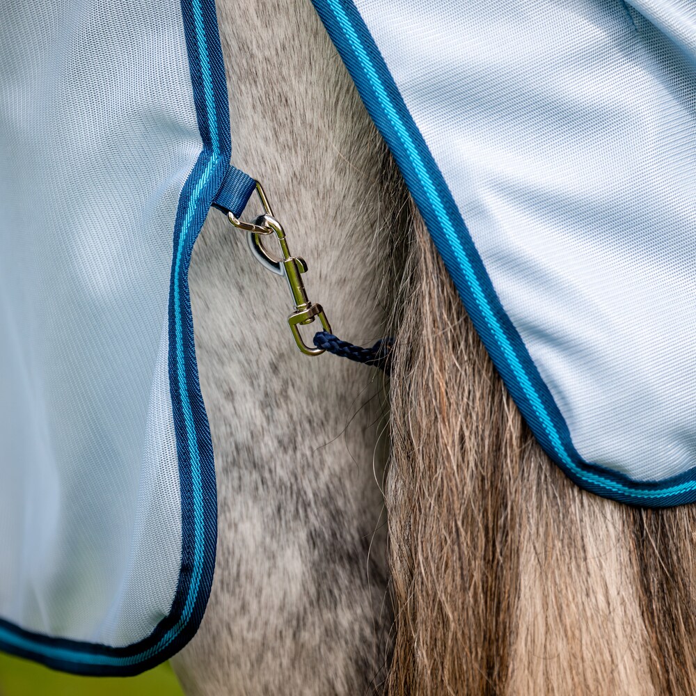 Insectendeken van gebreide polyester mesh. Singels, dubbele voorsluiting en staartriem. Compleet met afneembare nekdeken. Grote staartbeschermer en gepatenteerde Horseware-voorbeenbogen.
