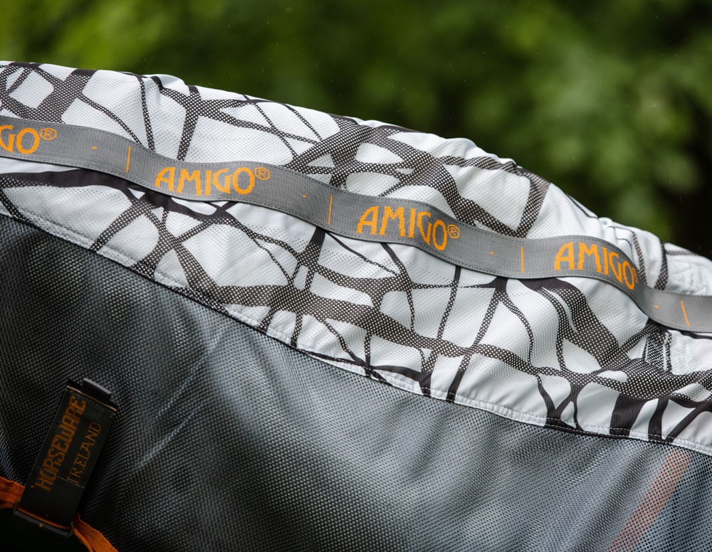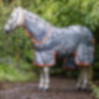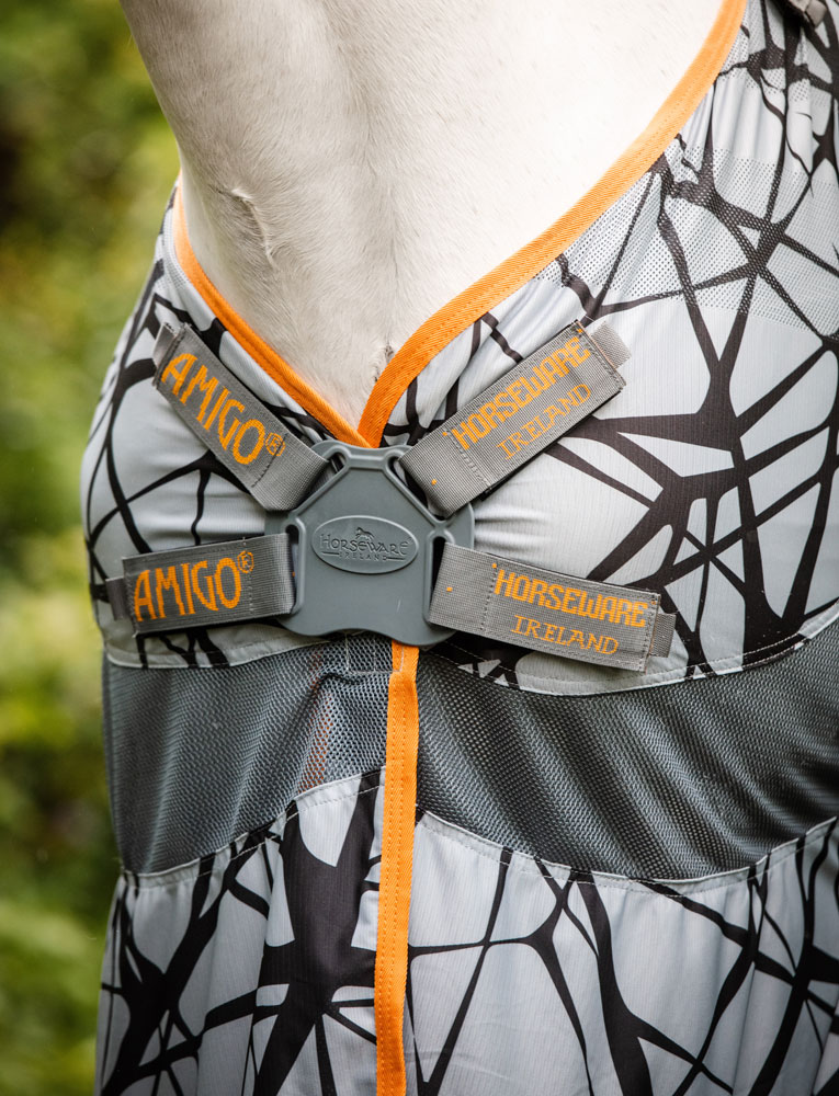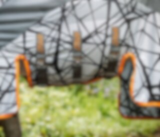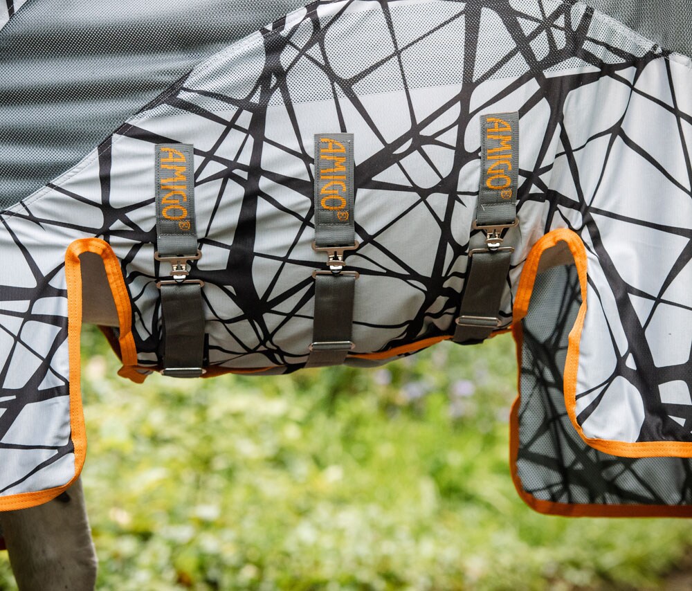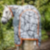 Vliegendeken met kleurenopdruk en patroon bedoeld om vliegen en insecten in verwarring te brengen. Onderzoek heeft aangetoond dat onregelmatige patronen, zoals zebrastrepen, het vliegen lastiger maakt te focussen en op het paard te landen. De kleurstellin