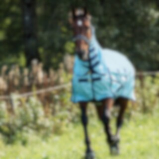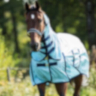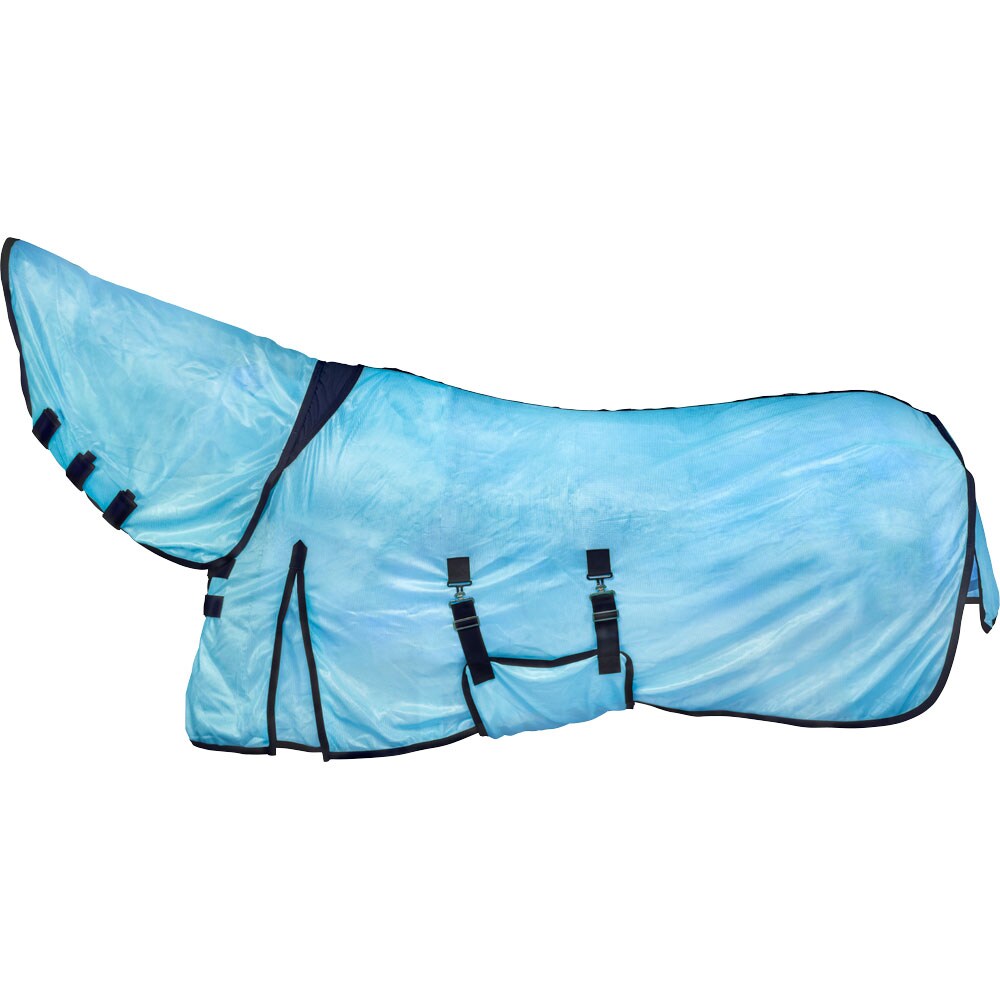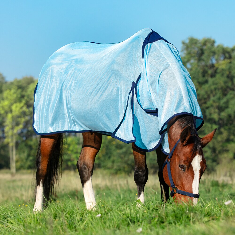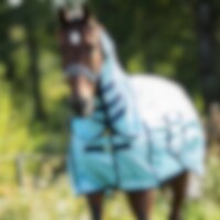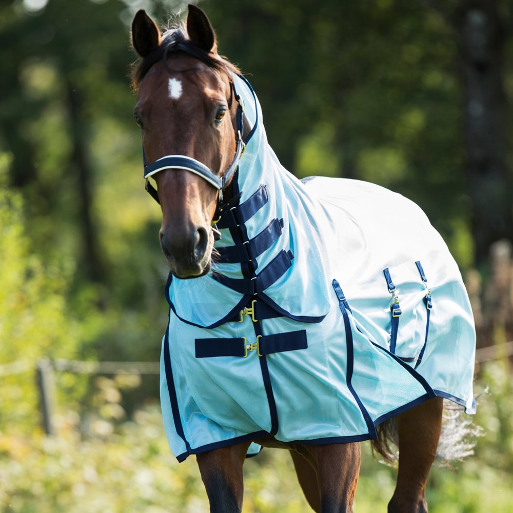 Insectendeken van fijn polyester mesh. Lycra-paneel op de schoft voor meer mobiliteit, nylon voering op de kam en schouders om schuren te voorkomen. Vaste nek met klittenbandsluiting. Haltersluiting, grote staartbescherming, beschermend romppaneel.