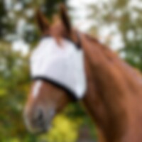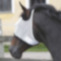Flughuva med brett kardborreband. Kantad med mjuk syntetpäls. Fungerar även utan grimma.