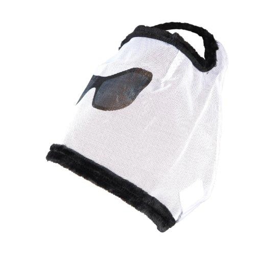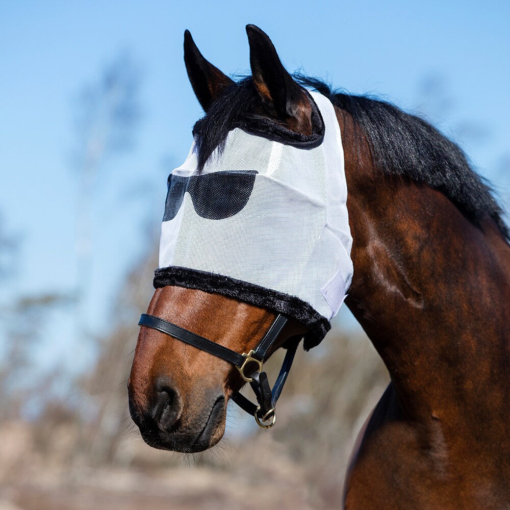 Flughuva i meshnät som skyddar hästens ögon mot irriterande flugor. Huvan har mjuk teddykant och brett och starkt kardborrlås. Skojigt glasögontryck i svart.