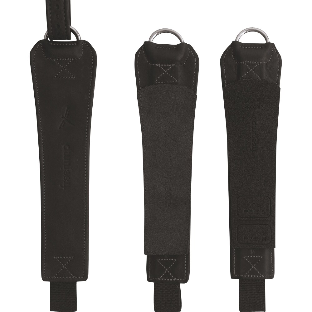 Stijgbeugelriemen van zacht leder met nylon versteviging. De binnenkant van het stijgbeugelleer is uitneembaar en wordt vastgemaakt met klittenband. Geleverd met één leren paar en één rubberen paar, wat zorgt voor extra goede grip. Kan op maat worden gesneden voor verschillende maten stijgbeugelriemen. Het platte, brede bovendeel zorgt voor een beter contact en zorgt er ook voor dat de stijgbeugel in de juiste positie komt zonder het been te blokkeren Past alleen op Freejump-stijgbeugels. S: < 150 cm, M: 150 cm - 170 cm, L: > 170cm. De maten verwijzen naar de geschatte lengte van de ruiter.