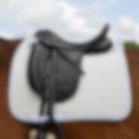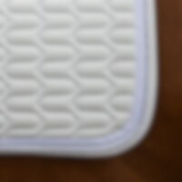 Zadeldek van polyester keperstof met een klein gewatteerd zigzagpatroon. Stevig combinatiekussen in 300g polyfill + 1,2cm schuim dat zorgt voor een stevig zadeldek dat op zijn plaats blijft en was na was zijn vorm behoudt. Het polyester coolmax interieur helpt vocht af te voeren om een comfortabele temperatuur voor het paard te behouden. - Mesh paneel langs de ruggengraat voor meer ventilatie. Versterkt bij de singel voor extra duurzaamheid, korte klittenbandsluitingen voor bevestiging aan de d-ring van het zadel zorgen ervoor dat het onder de meeste zadelmodellen past. Versierd met glitterlint en zijden bies in lurex. Wit zadeldek met witte binnenkant, andere met zwarte binnenkant.