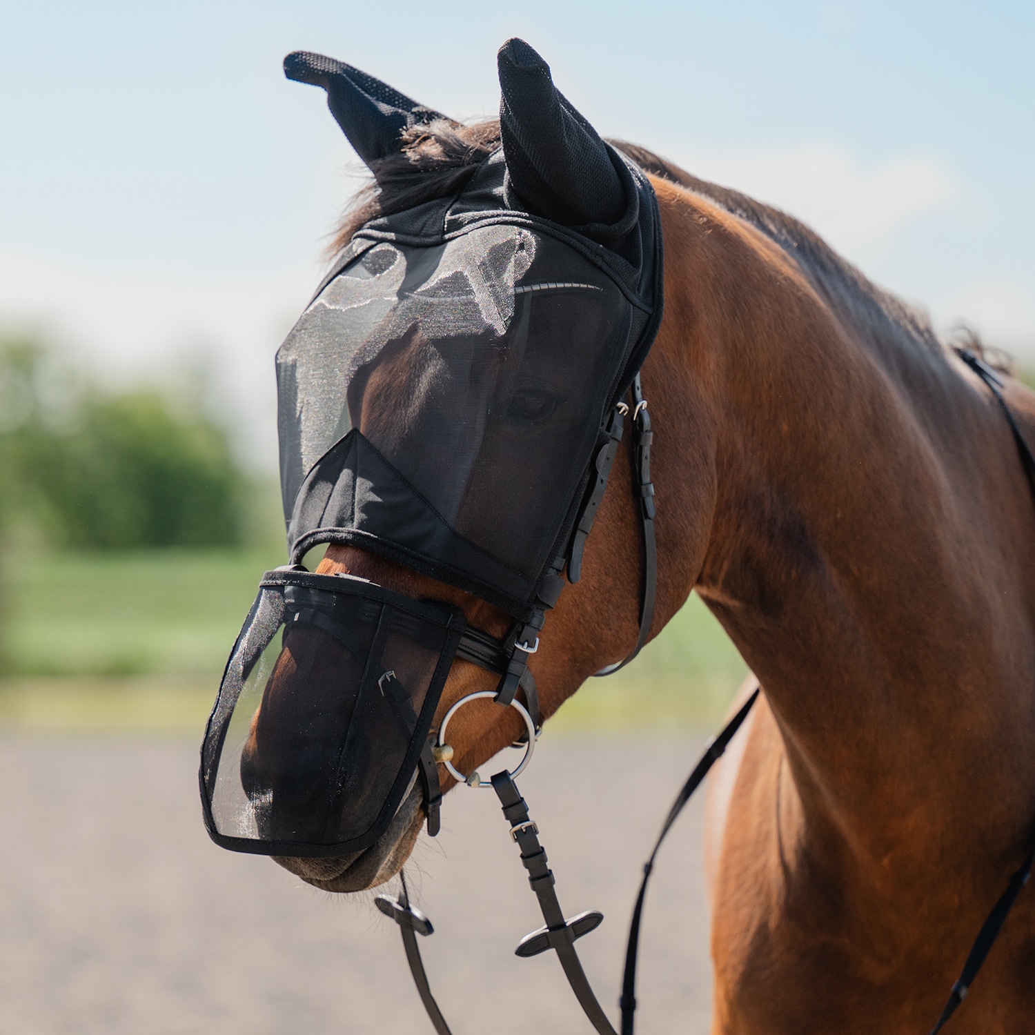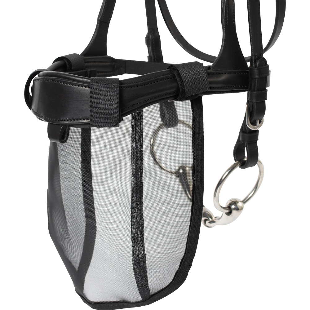 Neusnet van 300D nylon dat de gevoelige mond van het paard beschermt tegen bijvoorbeeld insecten of de zon. Gemakkelijk te bevestigen aan de neusriem met 4 klittenbandsluitingen. Kan helpen tegen 'hoofdschudden'.