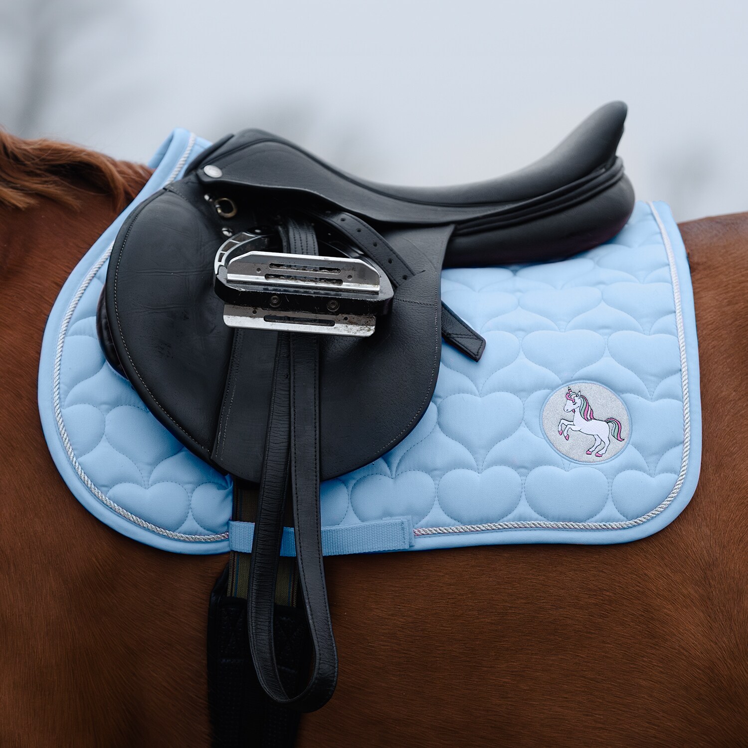 Een zadeldeken beschermt het zadel tegen het zweet en het vuil van het paard. Hier staan de dekens voor dressuurzadels en de algemene zadeldekens voor zowel grote paarden als kleine pony's. Als je zadel 41 cm of groter is, moet je de volledige maat kiezen, zelfs als de maat van het zadel een ponymaat is.